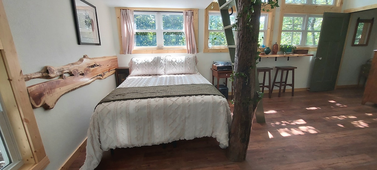 Sukeldu loodusesse meie eraldatud keskkonnasõbralikus puu otsa ehitatud majas, mis asub meie 110 aakri suuruses eraomandis oleva talu metsaga kaetud mäenõlval. Meie lemmikloomasõbralik 285 ruutjalga puu otsa ehitatud majas, mis sobib ideaalselt üksikisikutele või paaridele, kes otsivad rahulikku glämpingut, on kaasaegne ja maalähedane sisustus koos elava servaga riiulitega, hubane lofti lugemisnurk, välidušš ja üle 540 ruutmeetri suurune terrass, kus saab grillida, lõõgastuda ja kogeda vaateid metsamaale. Võta uuesti ühendust ja laadi end paremaks!