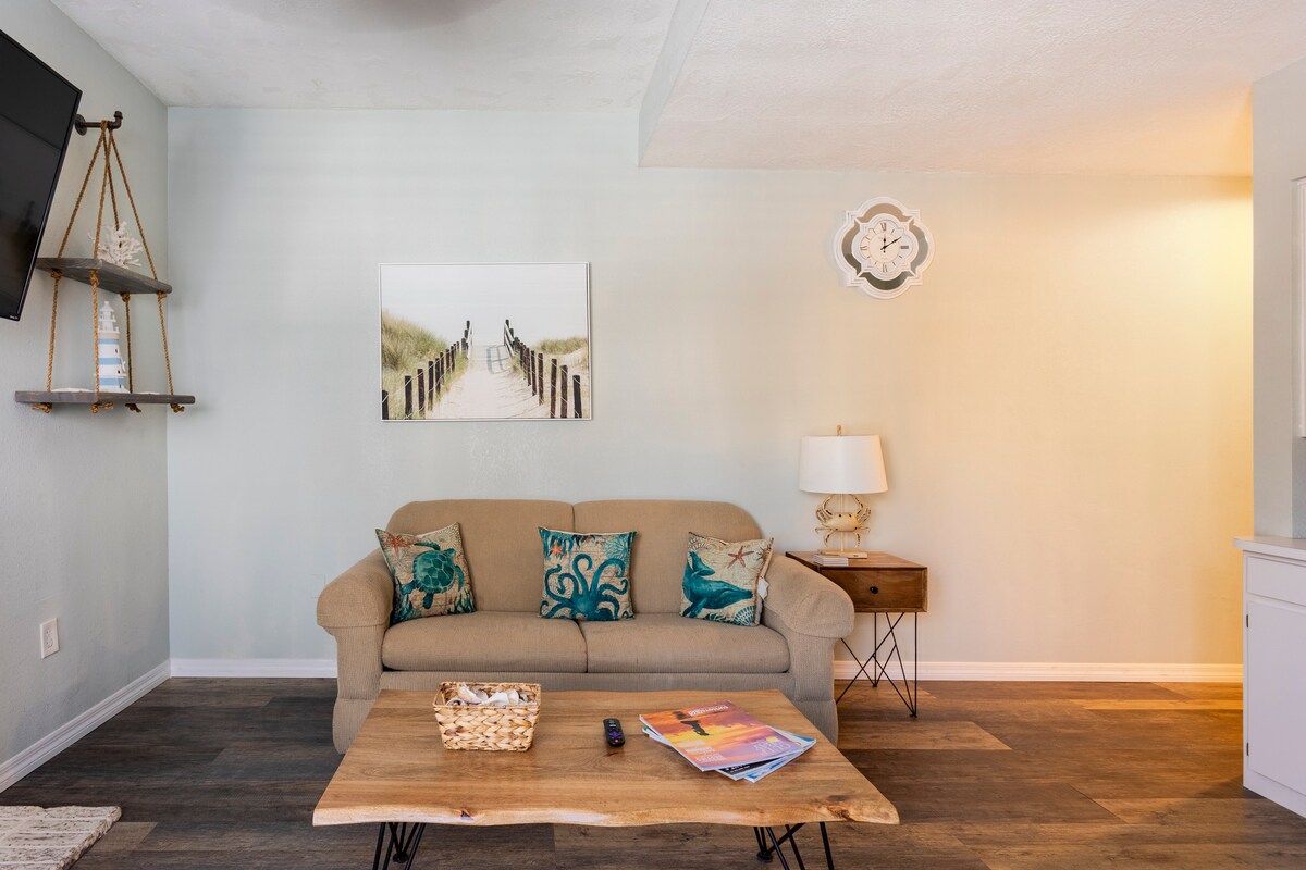 UUENDATUD kaasaegne hele ja värviline korter koos TASUTA SOOJENDATUD BASSEINIGA! Esimene korrus, TREPPE POLE. 2 miili rannast. Hullumeelne KIIRE WiFi - kiirusega 600 Mbit/s!!! Suurepärane keskne asukoht kahe kaubanduskeskuse, restoranide, parkide ja paljude kohalike lahe rannajoone lähedal. TURVALISE TARAGA vaikses kogukonnas on soojendusega bassein, jõusaal, tenniseväljakud ja gaasigrillid, mida saad nautida. Võta lihtsalt oma rannatekk ja ujumistrikoo kaasa ja LÕÕGASTU! Jalakäigu kaugusel nii paljudest kauplustest/restoranidest ja Pinellase rajast!