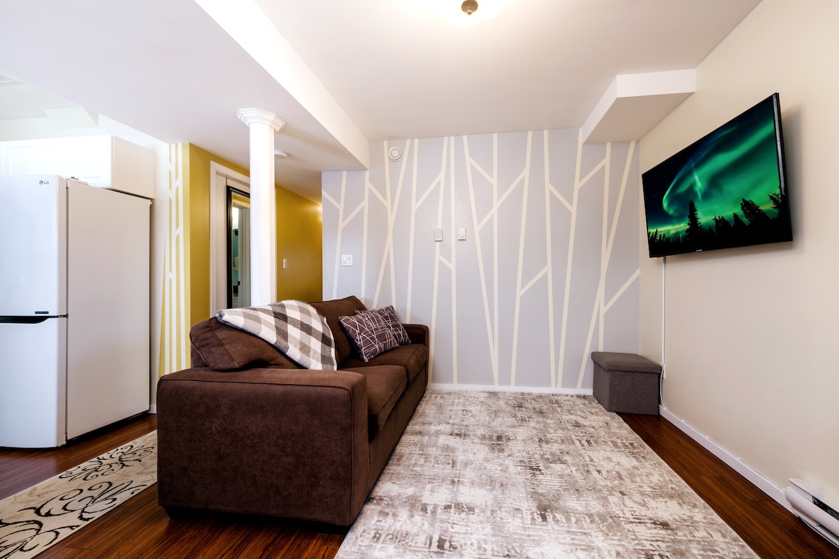 Kaunilt kaasaegne ja uuendatud kahe magamistoaga keldrisviit eraldi iseseisva sisseregistreerimisega. Vaiksel ummikul asuv majutuskoht on 10-minutilise jalutuskäigu kaugusel trendikatest restoranidest, baaridest, toidupoodidest, alkoholipoodidest ja jalutusradadest ning 3 kvartali kaugusel haiglast. 2-minutilise jalutuskäigu kaugusel on armas järveäärne rada, mis on ideaalne koht virmaliste vaatamiseks. Bussipeatus asub üle tänava, mis muudab reisid kesklinna ja vanalinna kiireks ja mugavaks. Tasuta parkimine äärelinnas.