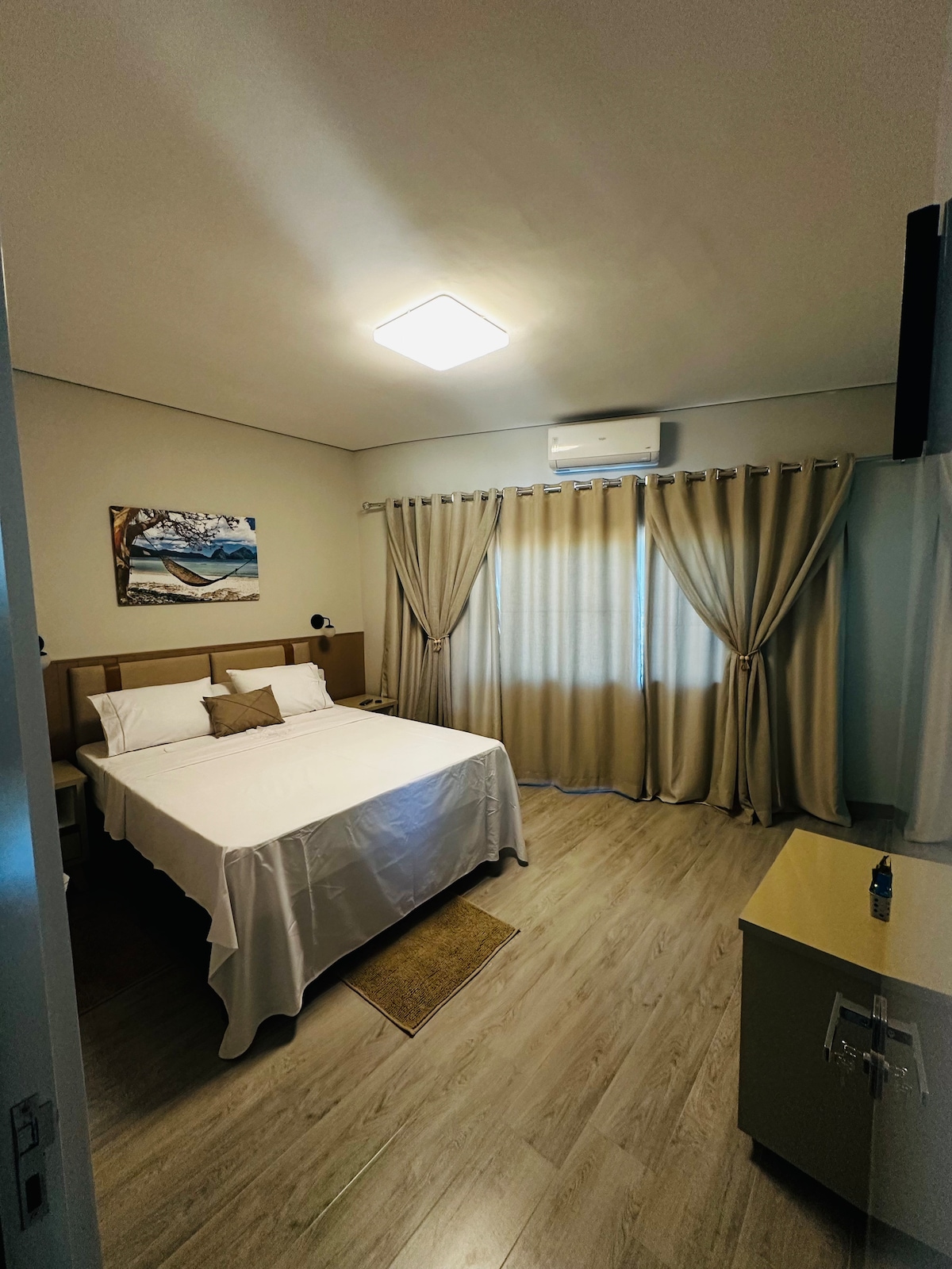 Relaxe com toda a família nesta acomodação tranquila. Pavimento térreo de um sobrado, com entrada independente, localizado na esquina da Av. Bahia com a Rua Rondônia, em frente à principal praia da cidade. Composto por 3 quartos, sendo um suíte. A suíte tem uma cama de casal e um sofá-cama duplo. Um dos quartos é mobiliado com uma cama de casal e o outro quarto tem uma cama de casal e um beliche. Na sala de estar, são conjunto de sofás 2 e 3 lugares. Acomoda até 10 pessoas.