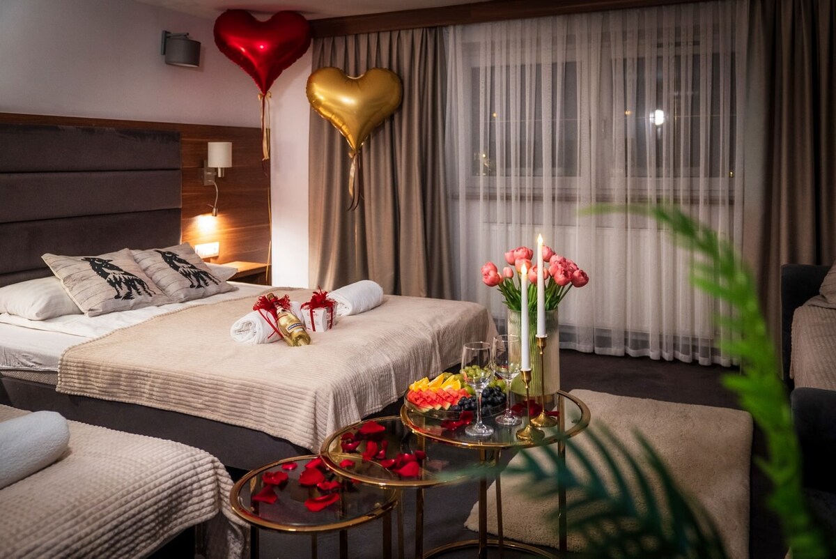 Kahekordne korter suure aknaga ja vaatega mägedele , kaasaegne stiil , pööra tähelepanu detailidele. Varustus : voodipesu , rätikud , föön, vedelseep, tualettpaber. Kapp , laud , lameekraaniga televiisor, kööginurk , keeduplaat, külmik, kraanikauss , söögiriistad, emal, veekeetja,. Suur peegel . Tasuta jälgitav parkimine. Saun , mullivann üürimiseks. Makstud