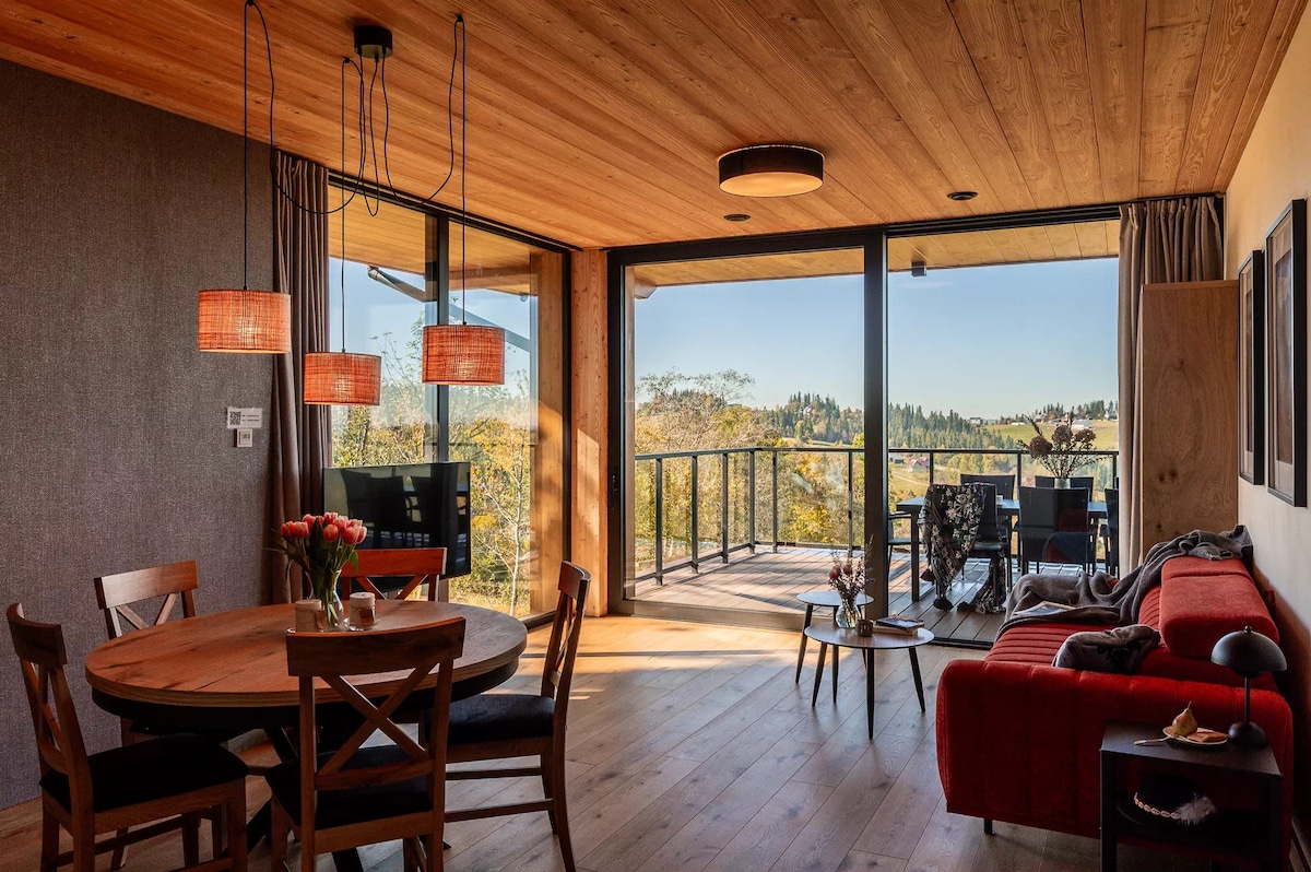 Po wejściu do Apartamentu 1 od razu poczujesz atmosferę górskiego luksusu — ciepło drewna, rzeźbione detale i nastrojowe światło tworzą klimat nowoczesnego szałasu pod Tatrami. Przestronny salon z panoramicznymi oknami płynnie łączy wnętrze z ogromnym tarasem widokowym — o poranku wypijesz tu kawę patrząc na Giewont i Kasprowy.