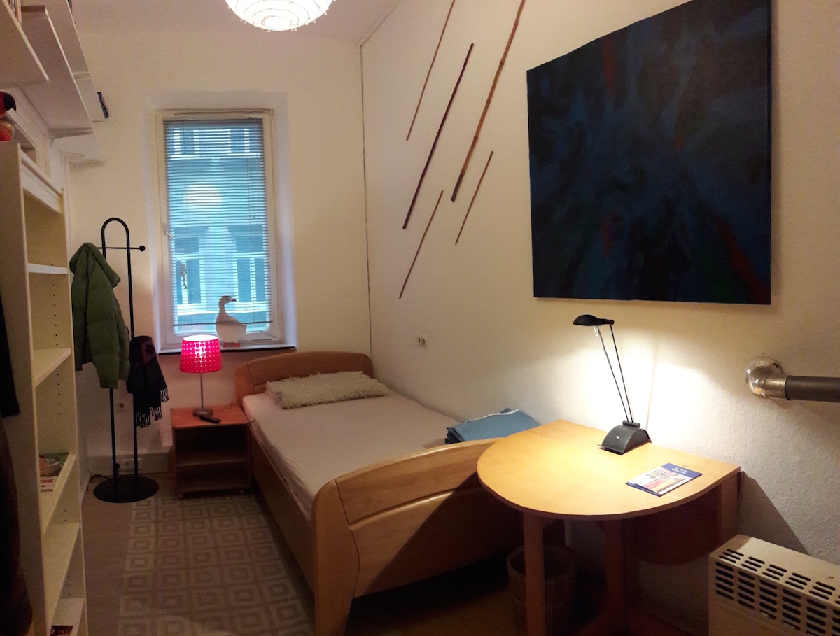 Keskne väike keldrikorter eraldi sissepääsuga. 120 x 200 voodi, sobib ainult ühele (1) inimesele. Iseseisev saabumine võtmekapi kaudu (kood broneerimisel). Netflix ja DAZN on saadaval. Majutuskohas on väga nõrk internetiühendus, seega ei sobi see kodukontorisse. Korter on varustatud väikese köögiga. Lisaks on vannituba hiljuti renoveeritud ning seal on dušš, kraanikauss ja WC .