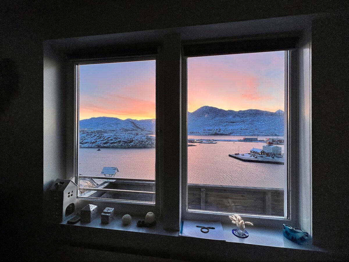 Her får du en hyggelig og praktisk lejlighed med det vigtigste til dit ophold. Perfekt som udgangspunkt for at udforske byen og Grønlands natur. Fra lejligheden er der en fantastisk udsigt over både havet og det majestætiske grønlandske landskab. Du kan nyde synet af det ikoniske fjeld Sermitsiaq, det rolige blå hav og den smukke Hjortetakken i horisonten – en perfekt kulisse til både afslapning og fotografering. Vi glæder os til at byde dig velkommen!