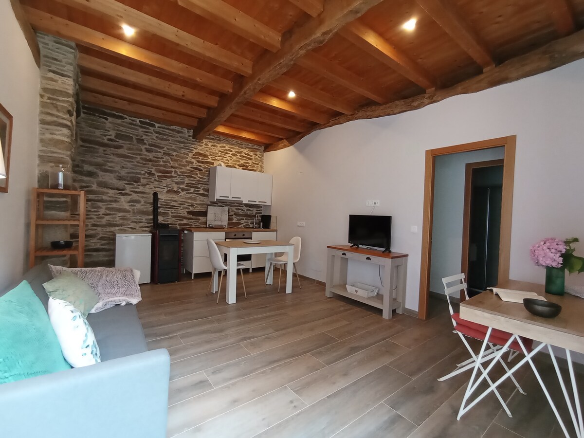 Loft-stiilis korter. Seal on kaheinimesevoodiga tuba, elutuba – köök, vannituba ja riietusruum. Teler, pesumasin, nõudepesumasin, kliimaseade (kliimaseade), pelletikamin, WIFI ja mullivann. Asub maapiirkonnas, vaikne ja väga hästi ühendatud juurdepääsuga Salnési maanteele ja Autopista AP 9-le, mis suhtlevad O Mosteiroga Rías Baixase peamiste linnade ja küladega. Ideaalne paaridele ja vallalistele. Ringi liikumiseks on soovitatav kasutada autot.