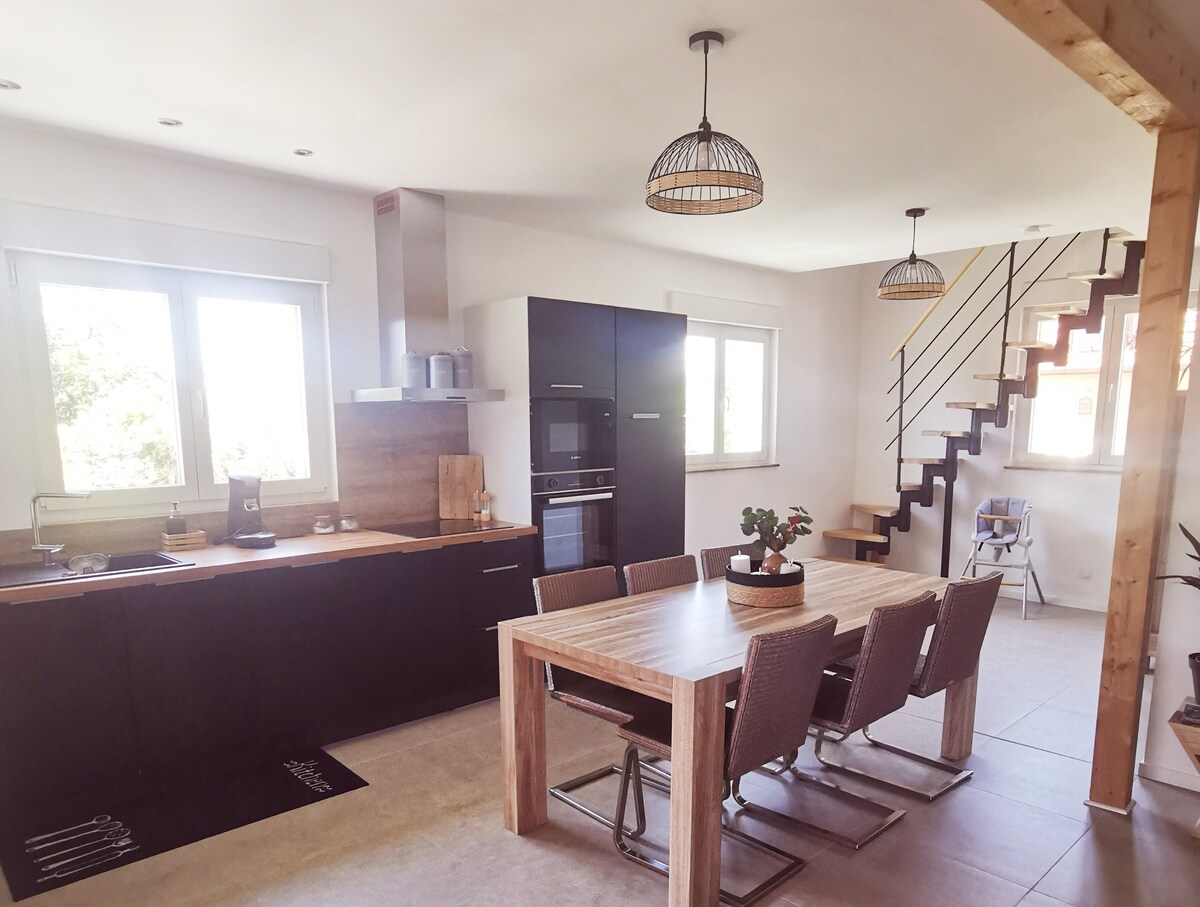 Võluv maamaja * ** kliimaseadmega, renoveeritud Alsace'i stiilis puitpaneelidega, asub Alsace'i maja teisel korrusel. Korter, kus on sisustatud köök, duši ja WC-ga vannituba, elutuba, saun, üks magamistuba 1,40 m kaheinimesevoodiga ning üks magamistuba kahe 1 m voodi ja ühe 90 cm voodiga. Saadaval on rätikud ja voodipesu Kokkupandav voodi, söögitool. Lamamistool Suvila kahe maakonna piiril, 7 km kaugusel Saksamaast. EUROPA PARKI lõbustuspark 20 min kaugusel. Saksa + (inglise keeles) Konditsioneer ja pööning. 🅿️ õues.