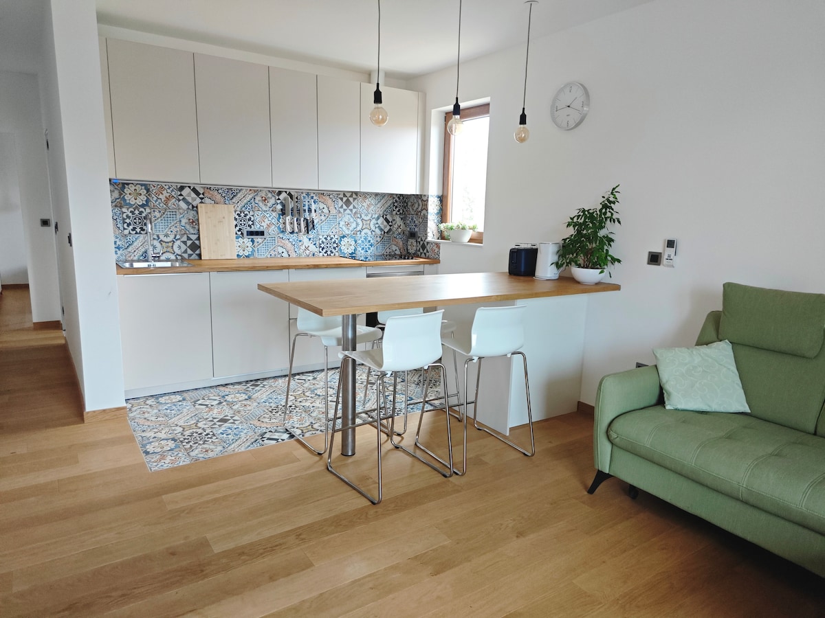 This charming apartment is suitable for younger guests, digital nomads and cycling fans as it offers a garage for bikes. It has a beautiful sea view with three balconies. It is located on the second floor (attic), so it is not suitable for guests with mobility problems due to the circular stairs. Distance from the seacoast is 250 m, and from the sandy beach 1000 (15 min walk). The nearest restaurant is 50 m away. Market "Stanić" , butcher, bakery 250 m, large markets: Lidl and Plodine 600 m.