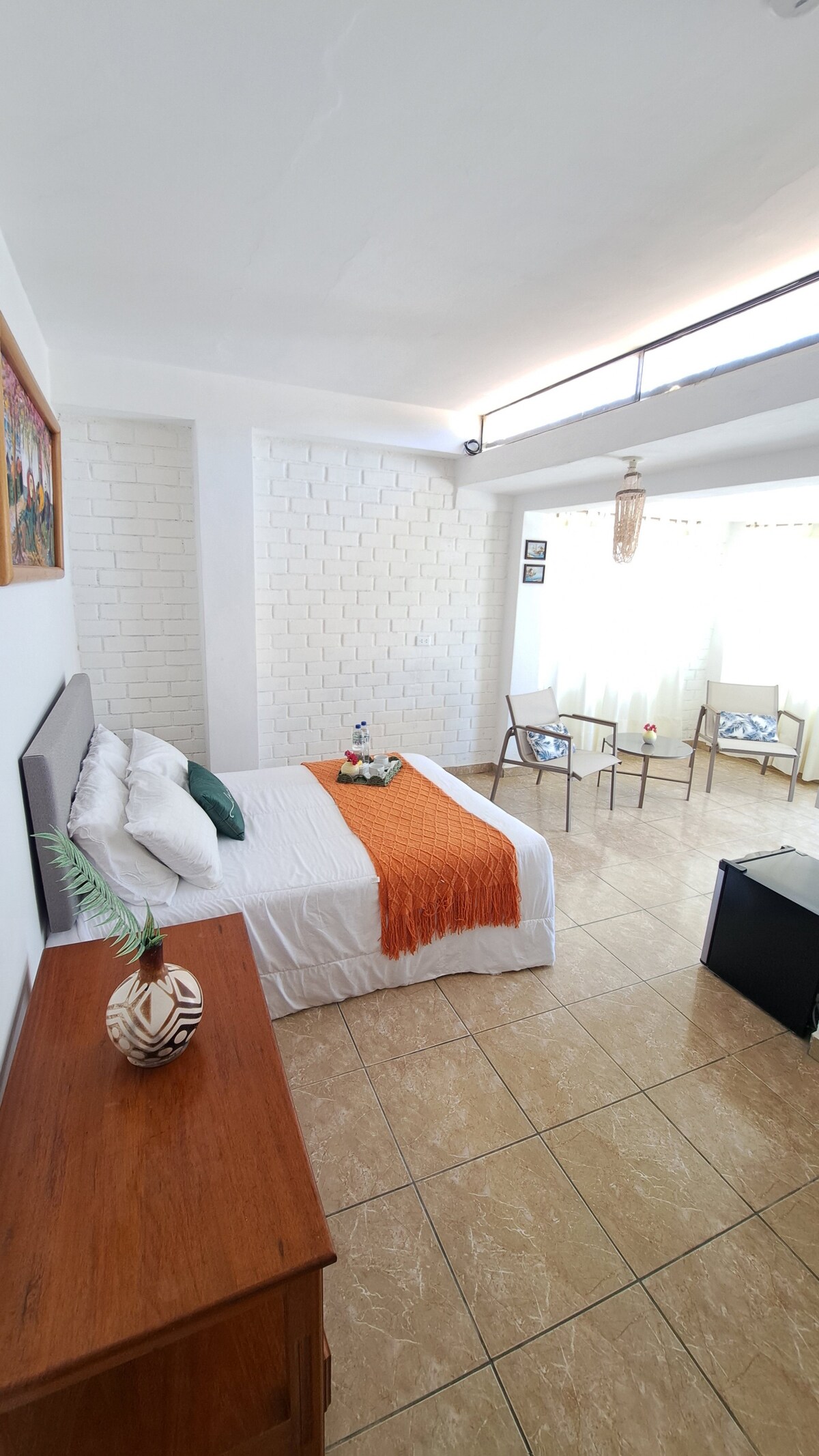 - Hotellituba (12 m2), mis asub 100 meetri või ühe kvartali kaugusel rannast Mancora kesklinnas.- Kaheinimesevoodi ja privaatne vannituba teisel korrusel.- Laeventilaatoril on keskmine kapp riidepuuga, öökapid (öökapid), täispikk peegel, sääsevõrguga aken, mis takistab putukate sisenemist sinu tuppa ning kust avaneb vaade aiale ja hotelli basseinile - sellest ei avane vaade rannale. - soe vesi puudub. - väljastpoolt võib kosta müra.