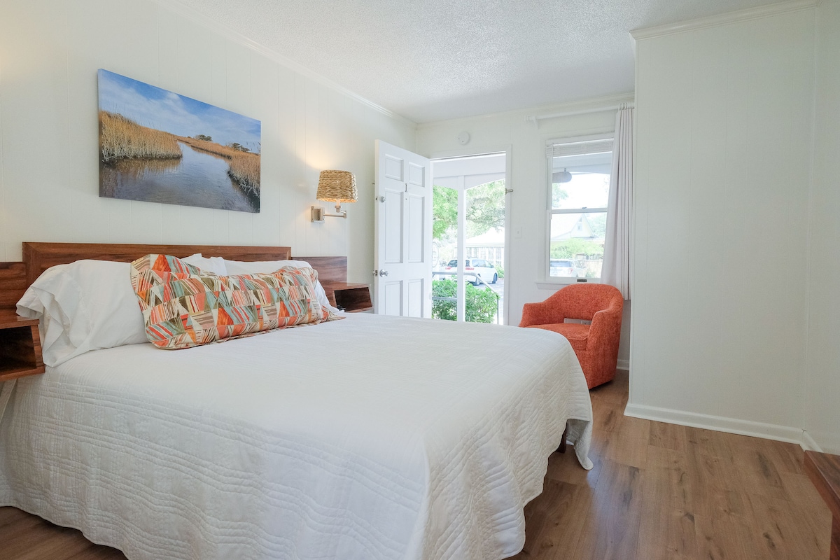 Freshly renovated 'Sea Oat Suite' Room 1 at historic Bluff Shoal Motel is a cozy Silver Lake hideaway in the heart of Ocracoke Village. Enjoy a queen bed, ceramic tub/shower bath, WiFi, cable TV, microwave, mini fridge, and Keurig. Park at your door, relax on the front porch, then head to the private pier and harbor deck for boat-watching, wildlife, and unforgettable lake views. No pets. Non-smoking.