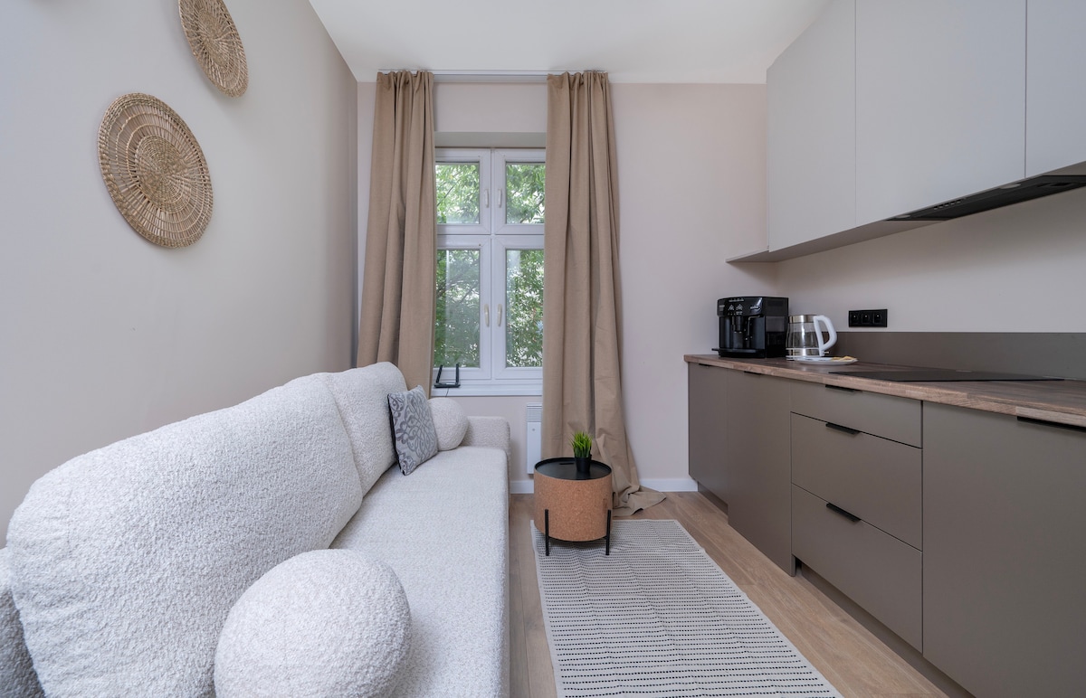 Kesksel kohal on rahu ja mugavus. Luksuslik korter, kus on kaks magamistuba, elutuba, köögi vannituba ja suur terrass, on varustatud kõigega, mida vajad lühi- ja pikaajaliseks viibimiseks. Vastupidi on Manufaktura keskus, kus on poed, restoranid, kino, ronimissein, jõusaal. Vanalinna park 800 m. Suletud elamukinnisvaras tasuta parkimine. Suurepärane majutuskoht linna avastamiseks ja ärireisiks.