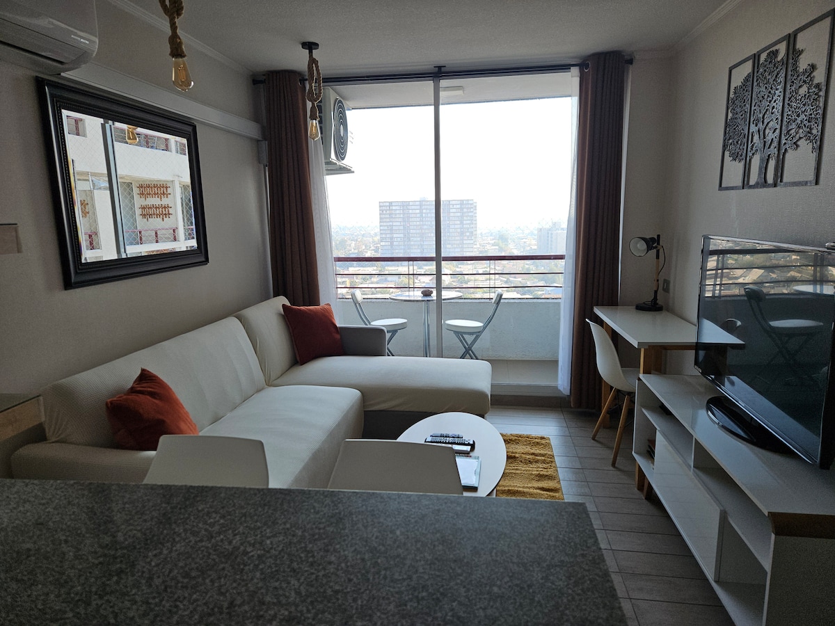 Modern apartment, 22nd floor, spectacular panoramic view and A/C. Unbeatable location: Right in front of Mall Arauco Maipú, near Outlets and Clínica Indisa. 10-15 minutes from SCL Airport and immediate access to Vespucio and Autopista del Sol, near Ruta 68. Maximum comfort (2 Bdrm. / 1 Bath): Equipped with modern A/C. Thermopane windows and blackout curtains for total silence. 100% Autonomous Check-in (24/7). Private Parking, Smart TV, fast WiFi, equipped Kitchen, and Washing Machine.