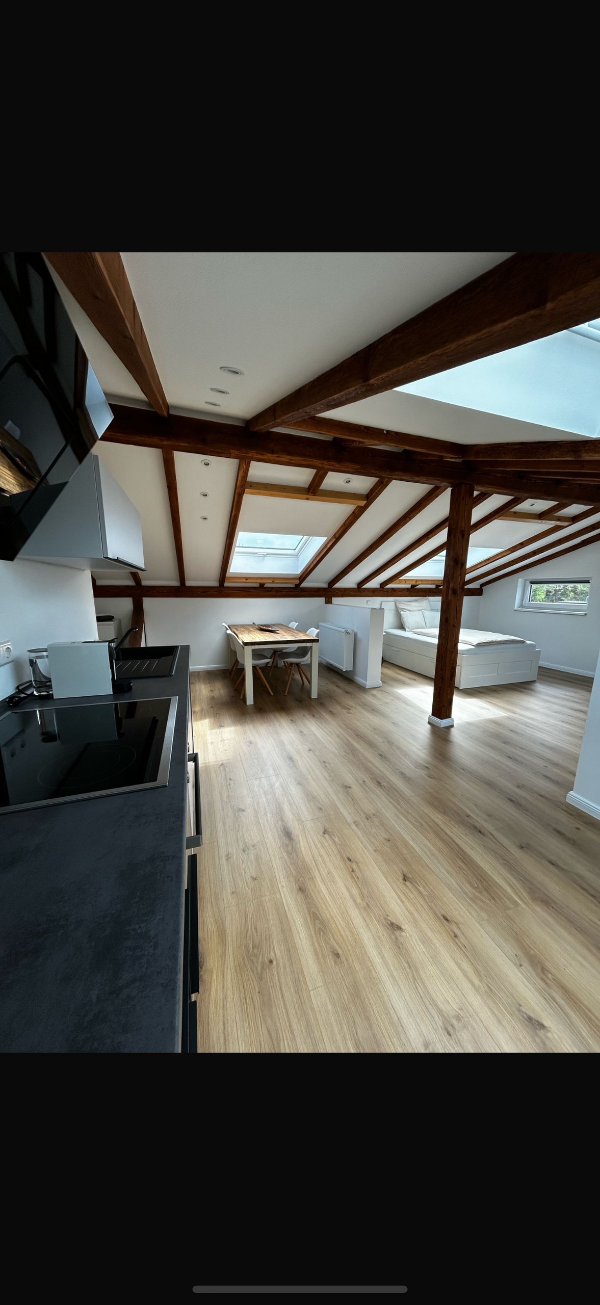 Die ehemalige Gesindekammer des ursprünglichen Bauernhofes wurde von uns liebevoll zu einer geräumigen Dachgeschoßwohnung ausgebaut. Die bis in den Giebel ausgebaute Wohnung strahlt einen ganz besonderen Charme aus. In der 75qm-Wohnung gibt es ein Schlafzimmer mit Doppelbett und Babybett und einen großen Wohnraum mit offener, voll ausgestatteter Küche. Das moderne Badezimmer hat eine ebenerdige Dusche mit Wandheizung.