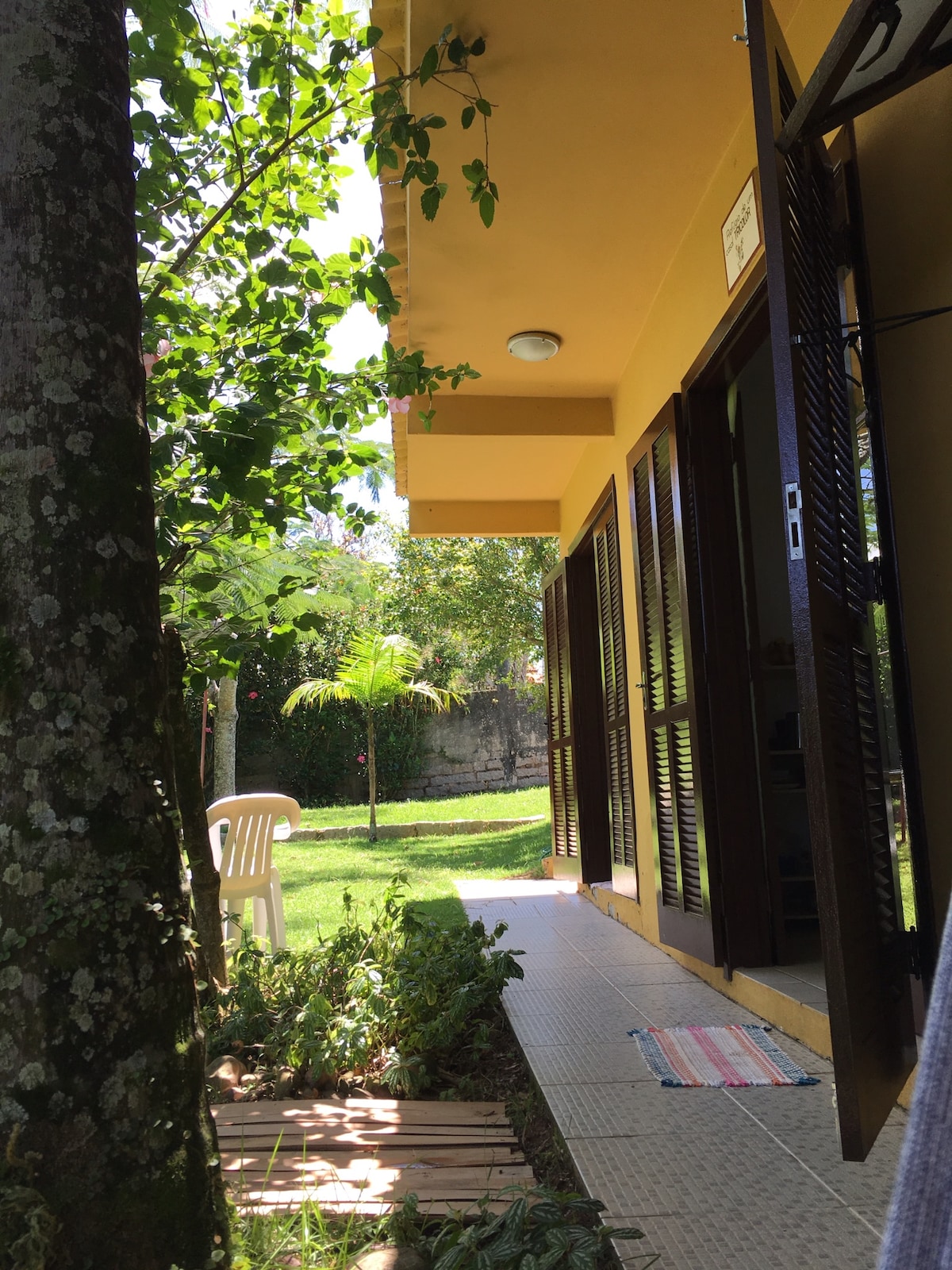 Üürile anda avatud ruum teisel korrusel, kus on kaks kaheinimesevoodit queen-size vooditega ja laeventilaator igas magamistoas, väliköök ja vannituba, suur rõdu võrkkiige konksudega, kaasaskantav grill, avatud parkla elektroonilise väravaga, 600 meetri kaugusel Pinheira keskel asuvast rannast, 5 km kaugusel Guarda do Embaúst ja 5 km kaugusel Sonho rannast.Märkus: me ei paku voodipesu.