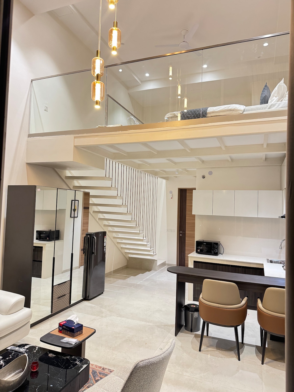 Welcome to your Luxury Loft with Balcony, a private duplex apartment on the 10th floor, with skyline views of the city, designed for comfort and style. A bright double-height living area with elegant decor, warm lighting, and cozy seating. Upstairs is a king-sized bed and a dedicated workstation. Step onto the balcony for evening tea or coffee . Enjoy high-speed Wi-Fi, Netflix and chill on the Smart TV, a fully functional kitchen, self check-in, and all comforts for a stylish stay in Gurugram.