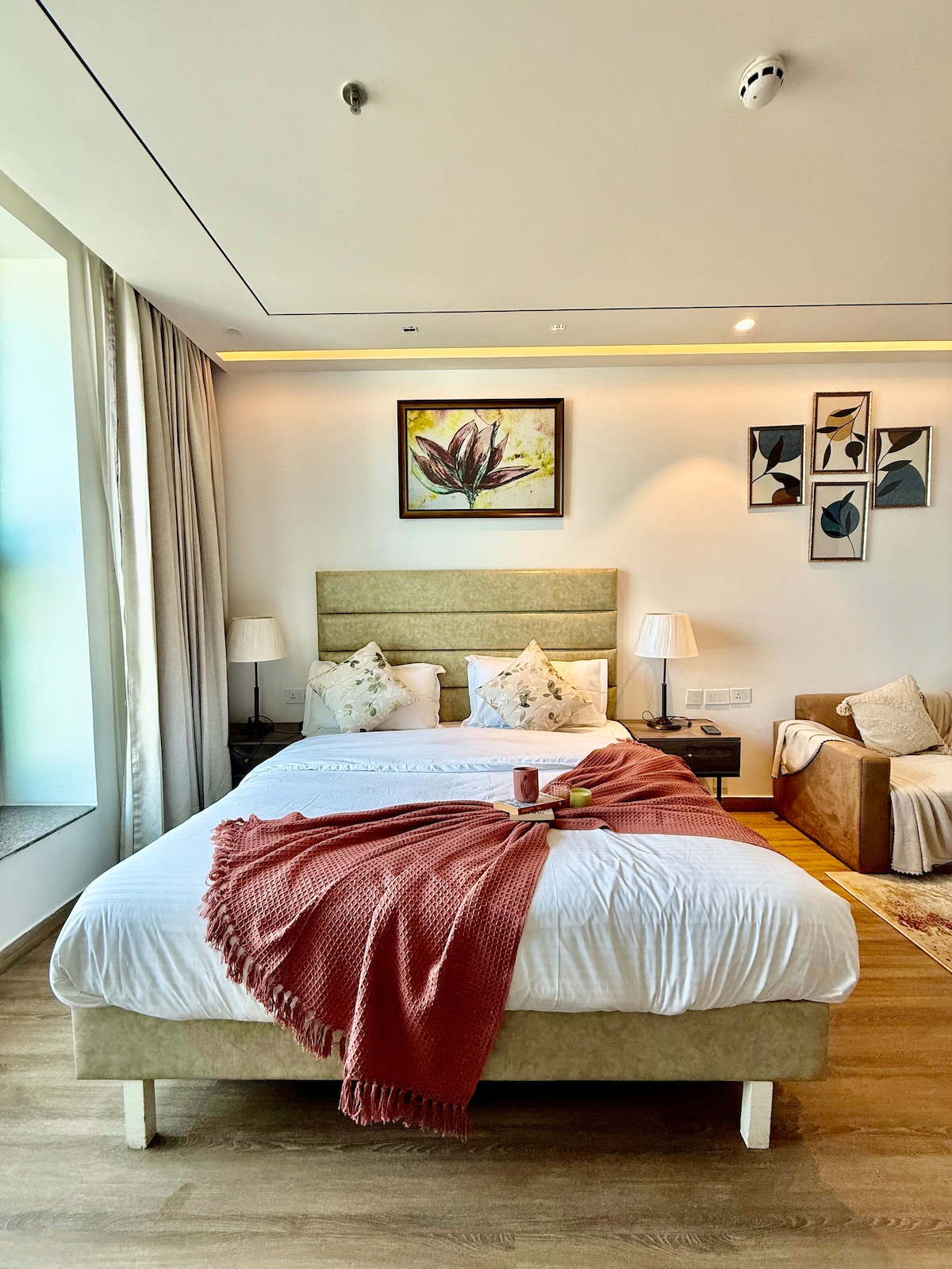 Experience serene comfort in this executive 1BHK, perched above a vibrant mall in Gurgaon. Enjoy a dedicated workstation, ultra-clean setup, high-speed WiFi, and free parking. Our strategic location offers easy access from NH48, Dwarka Expressway, SPR, and major hubs like American Express, TCS, Skyview Corporate Park, DLF Corporate Greens. Find Inox, pubs, and restaurants within the premises. Cabs are available 24/7. The stay is ideal for both business and leisure travellers in Gurgaon.