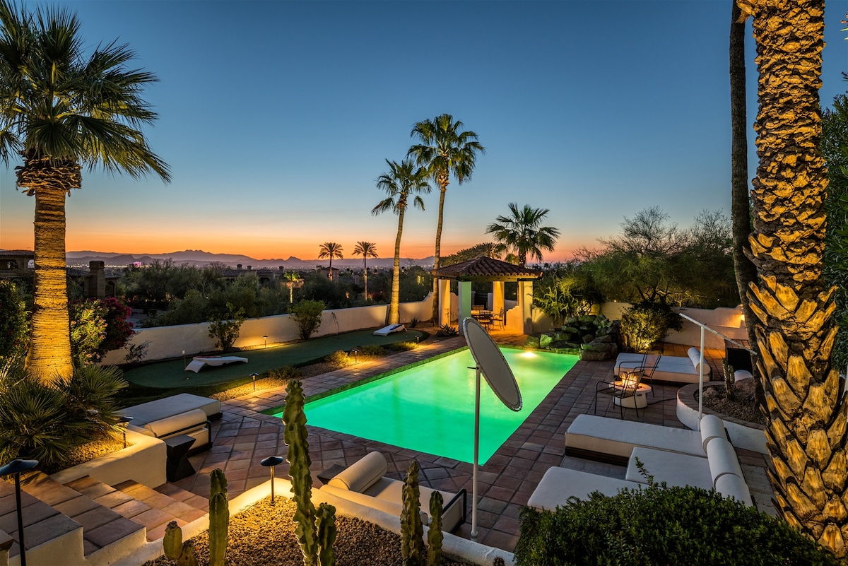Tere tulemast Varjatud Hacienda Scottsdale 'i! Lõbus ja omapärane puhkus kauboide stiilse sisekujunduse, basseini, spaa, karaoke ja mängudega - ideaalne poissmeeste, perede või golfireiside jaoks. Magamiskohti on 10, mugavad voodid, nutikad telerid, piljardilaud ja täielikult varustatud köök. Lõõgastu palmide all, harjuta kiike minipuhastusrohelisel või lõõgastu oma privaatses tagahoovis asuvas oaasis, kus on hubane istumisnurk ja väliteler. Kierland Commons, parimad golfiväljakud, kevadkoolitus ja palju muud!