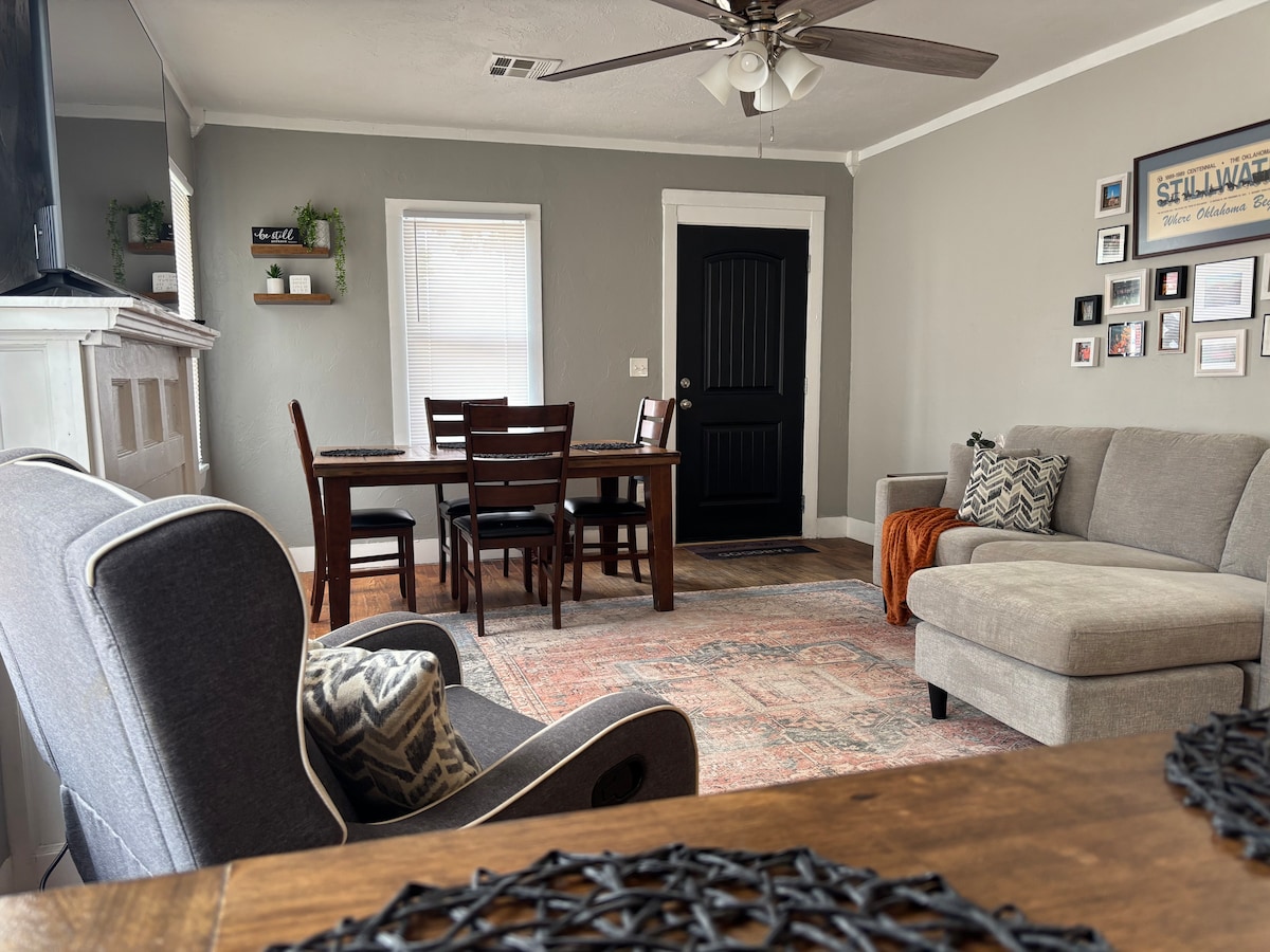 Tere tulemast meie hubasesse talumajja peatänaval, mis asub kesklinnas vähem kui miili kaugusel Boone Pickens staadionist. Naudi tasuta parkimist mängupäeval ja 2 magamistoaga talumaja hubast soojust suure väliterrassiga. Naudi mängupäeval koos pere ja sõpradega koos koos meie suurel terrassil, grillil ja lõkkekohas viibimist. Samuti on meie terrassil suur 40 000 BTU propaaniga gaasipõletusahi, mis hoiab sind soojas jahedatel sügisesetel jalgpallimängudel.