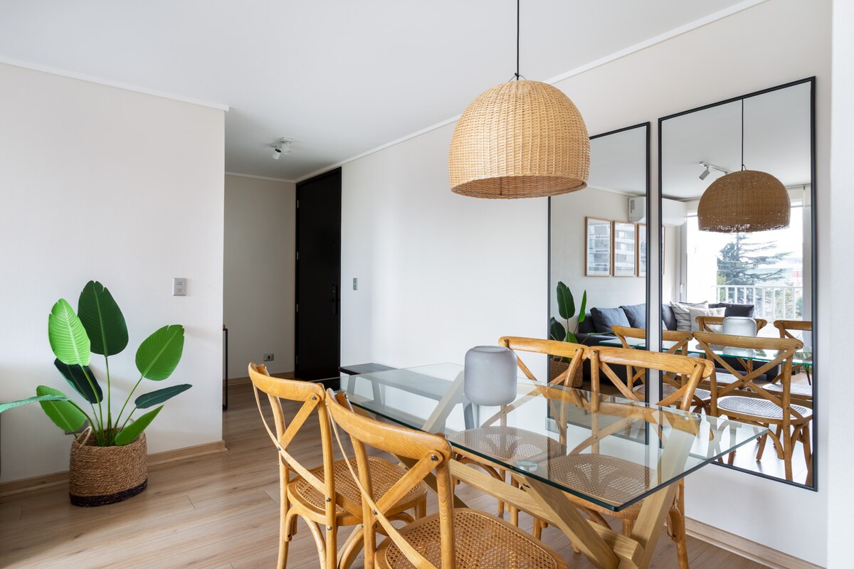Mugavus ja stiil suurepärase asukohaga. Uus maitsekalt sisustatud korter ja detailid, mis kutsuvad sind end hästi tundma. Sellel on terrass ja vaade mägedele, parkimine, kaks magamistuba, kirjutuslaud, kliimaseade, kiire WiFi, nutikas teler ja täielikult varustatud köök, jõusaal. Asub Ñuñoas, vaikses ja turvalises piirkonnas, mõne sammu kaugusel metroost ja Mall Plaza Egañast, mida ümbritsevad gastronoomia, poed, kliinikud ja teenused. Ideaalne asjatundlikele reisijatele, kes soovivad puhata, mugavalt töötada või Santiagot avastada!