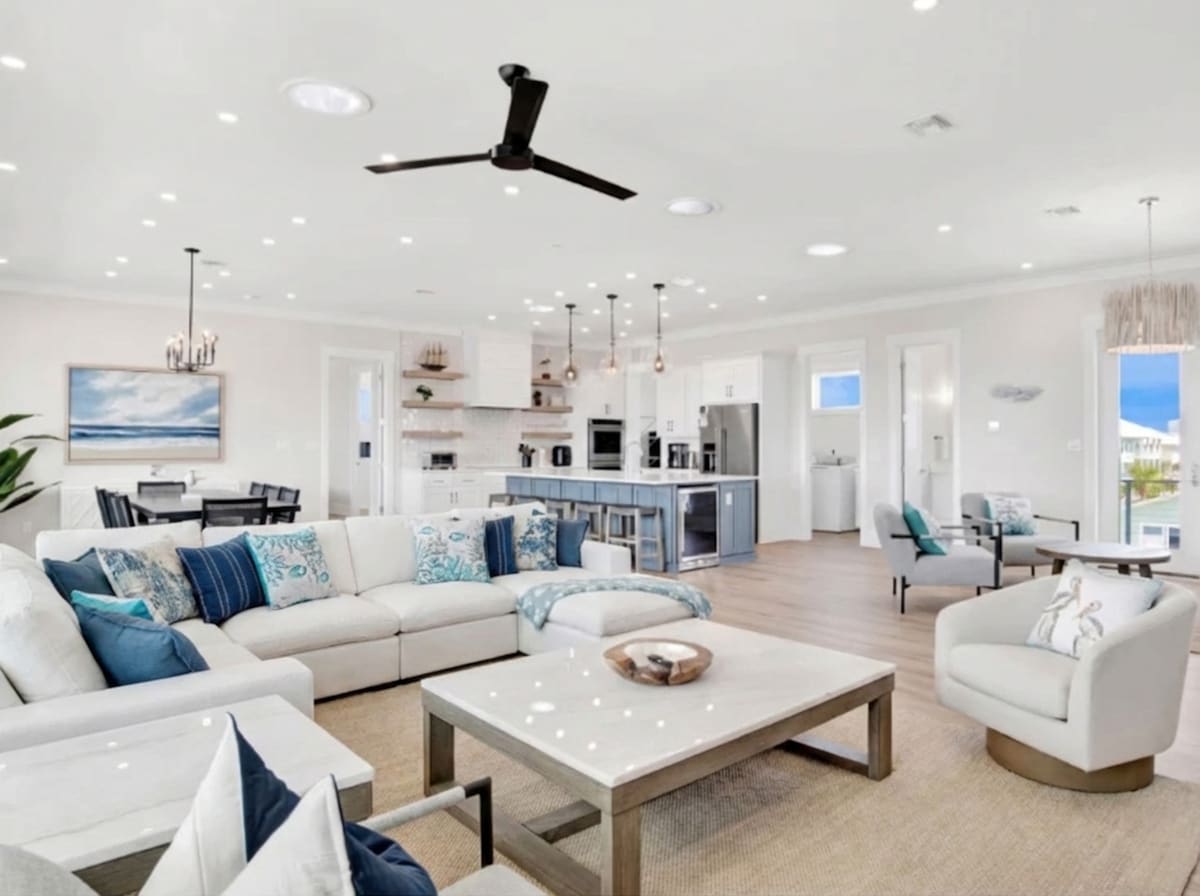 King Beds • Elevator • Pool • 100" QLED TV • Beach Gear • Chef’s Kitchen • Tiki Bar • Ping Pong • Dock Getaway to Marbella, a spacious beach retreat curated for families and groups. This gated coastal home features multiple comfortable King bedrooms, an elevator, and easy indoor/outdoor living. Enjoy Gulf views from balconies and the rooftop deck, steps to a quiet beach, community pool, and dock. Inside, relax with a 100" QLED TV, arcade, ping pong, fire pit, chef’s kitchen, and beach gear.