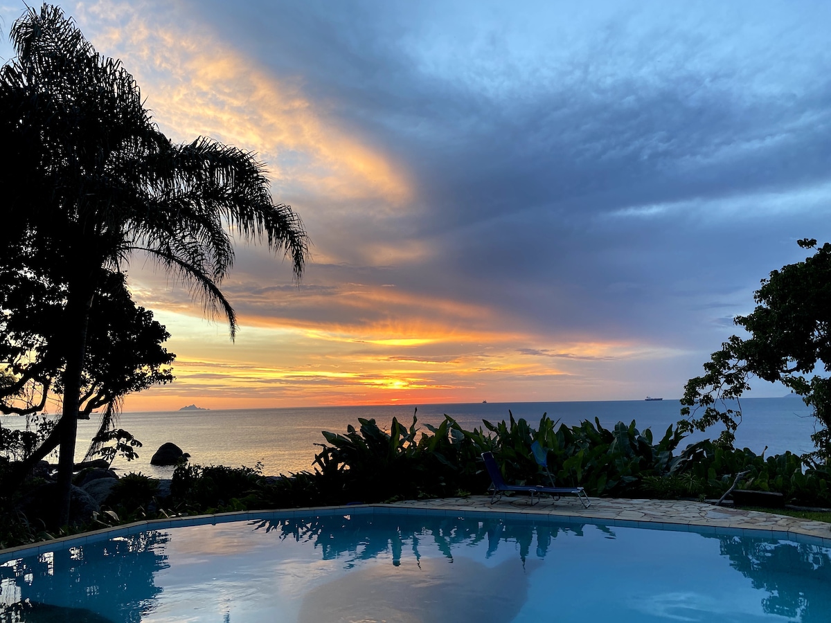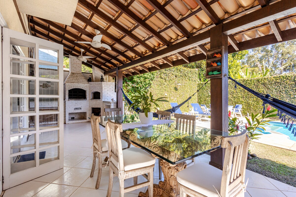 120 m² maja keset Ilhabela vana veepargi loodust, 2 hubast sviiti 43-tollise Smart TV-ga ja sooja/külma õhuga. Võluv tuba 65-tollise nutiteleri ja sooja/külma õhuga. Täielik köök suure 430 l Panasonicu külmkapiga, 1000 Mbps kiire kiudoptiline WiFi ja privaatne tagahoov grilliga ja privaatne looduslik bassein. Ülakorrusel on king-size voodiga sviit, kust avaneb vaade tähtedele, vannile ja rõdule. Suur rõdu koos piljardilaua, võrkkiige ja sillaga kose lehtla juurde.