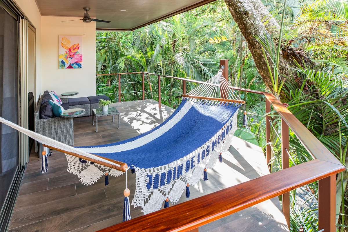 Playa Matapalo; steps from the beach! Our luxurious suites offer a breathtaking bird’s-eye view of the lush garden, where you can spot monkeys, macaws, toucans, and sloths right from your hammock. Each suite features a spacious patio furnished with comfortable lounge seating, perfect for relaxing outdoors. Thoughtfully designed, the suites include everything you need for a restful stay: a large king-size bed, air conditioning, ceiling fan, mini fridge, and a generously sized bathroom.