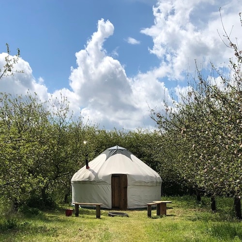 Meie väike ökokamp meie orgaanilises õunaaias, vaikne puhkus peredele ja paaridele Cambridge 'i ja Ely lähedal. 4 muruplatsi telkimiseks ja 4 glämpinguvõimalust – jurta, tipi ja 2 kellatelki õunapuude vahel. Meie mahetalu on metsloomade pelgupaik. Tutvu meie 117 aakri suuruste heinamaade, metsa- ja viljapuuaedadega, vaata meie hobuseid, lehmi ja kanu. Proovi meie maitsvat õunamahla, siidrit, veiseliha ja vorste. Peresõbralik, eksklusiivne kasutus grupibroneeringute jaoks. Soovitatavad lõkketulekahjud