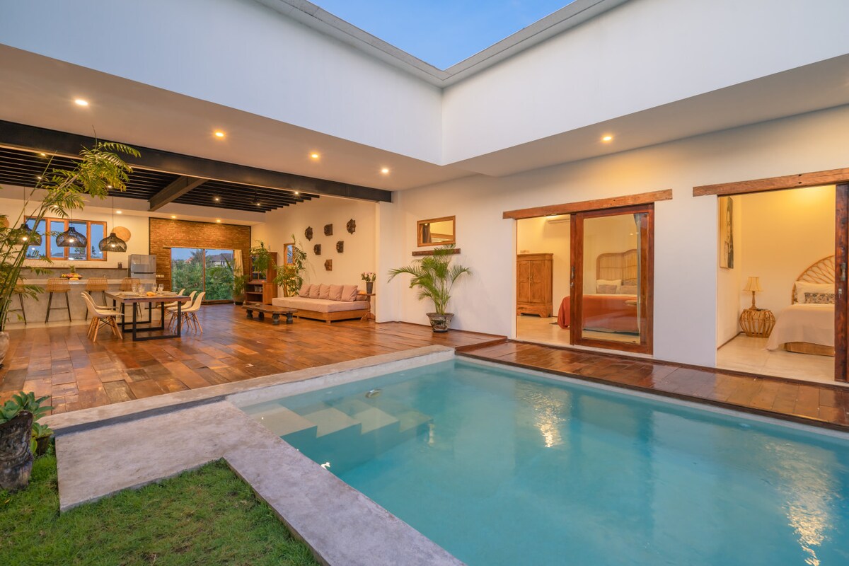Welcome to Villa Aarka – Your Ultimate Bali Retreat Avasta täiuslik segu kaasaegsest luksusest ja Bali sarmist selles 2BR, 2Bath villas. See avatud planeeringuga elutuba, mis ühendab kaasaegse disaini troopilise esteetikaga, on see sinu privaatne paradiis. Villa Aarka asub vaid lühikese jalutuskäigu kaugusel parimatest kohvikutest, restoranidest ja kauplustest, kuid asub vaikses naabruskonnas ning pakub ülimat mugavust. Broneeri oma majutuskoht kohe ja koge täiuslikku puhkust Balil!