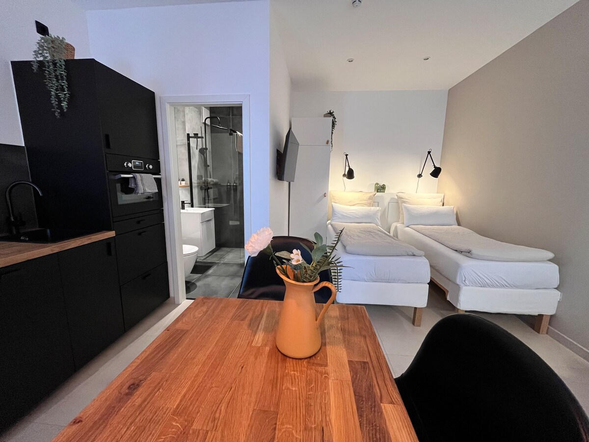 Our five newly built, side-by-side studio apartments are modern, featuring underfloor heating, a combined living/sleeping area, and an open kitchen. Each apartment includes a separate bathroom with a large rain shower, plus a table and two chairs outside. Shared amenities include Wi-Fi, washing machine, dryer, and gym. Welcome gifts, coffee, tea, spices, towels, bed linen, and toiletries are all provided.