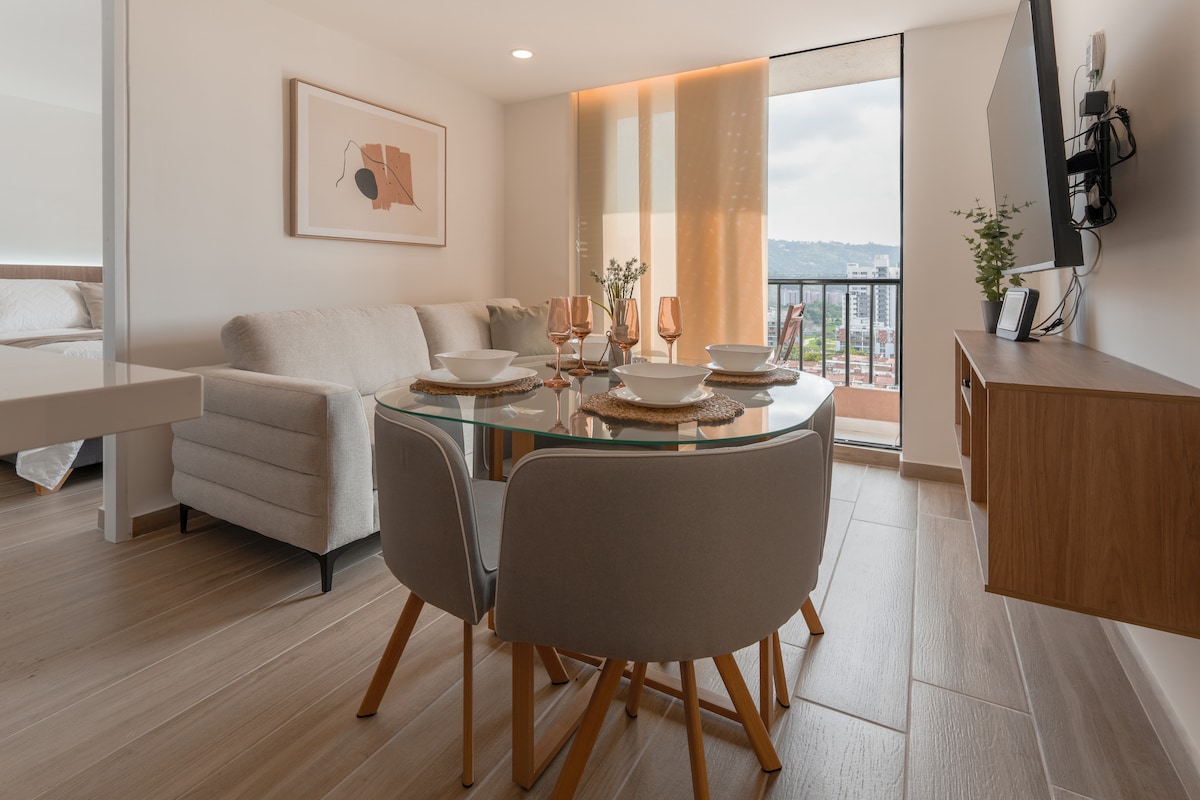 Ilus uhiuus korter. 10. korrus hämmastava päikeseloojangu vaatega. Keskne asukoht. Elamu ja turvaline ala Cacique Mall 'i ja Neomundo konverentsikeskuse kõrval, lihtne juurdepääs Carrera 33-le,Cabecerale,Girónile ja Floridablancale. 2 magamistuba, 2 rõdu, võrkkiik, 2 vannituba, 2 voodit, lisavoodi ja diivanvoodi. Suurepärane valgustus ja ventilatsioon, 300 Mbit/s WIFI, 2 telerit, millel on juurdepääs DirecTvGO-le, Netflixile, Amazonile ja HBO-le. Kompleksi esimesel korrusel, kus on muu hulgas väike turg, pagariäri, apteek.