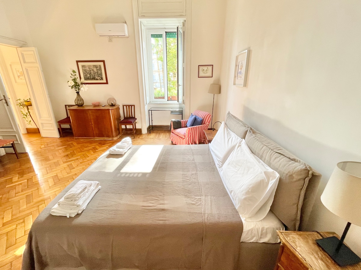 Elegantne, keskne, väga valgusküllane, vaikne, vaatega aiale, maitsekalt sisustatud, ajaloolises hoones, kõige eksklusiivsemas naabruskonnas, PiazzaAmedeos, kõige ilusam ja roheline, metroojaam ja kõik lähedal, baarid, restoranid, poed, alates kõige iseloomulikumast kuni kõige elegantsemini, mõne minuti kaugusel on Napoli imeline mererand. Varustatud kõigi mugavustega, ööpäevaringne uksehoidja, lift, kiire wifi, kliimaseade ja küte, nõudepesumasin, pesumasin.