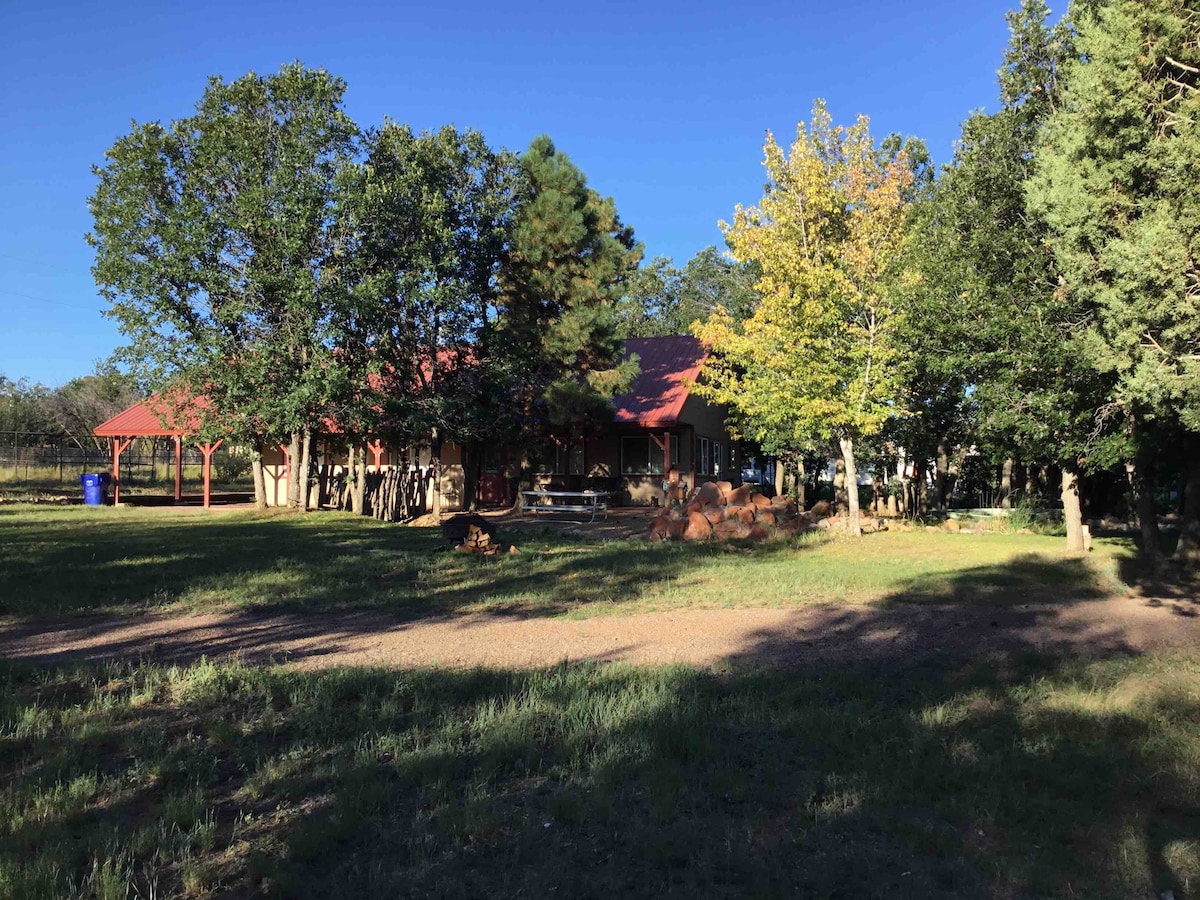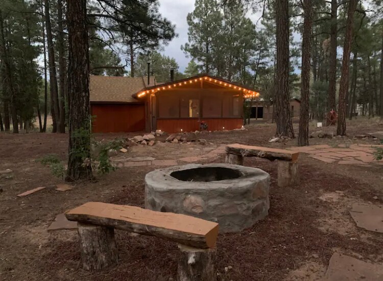 Beautiful Bear Pond Cabin WiFi, Dish Satellite, horseback riding. 2 bedroom 2 bath "Bear Pond" Cabin near Mogollon Rim sleeps 4-5. Indoor gas fireplace. Back yard has Pond, outdoor fire pit and seating for smores, bbq etc. Pet Friendly fenced back yard. In Bison Ranch cabin community with horse back riding, fishing, tennis, basketball and more. Dish Satellite and WIFI with free coffee included. Clean and Sanitized. Need more room? We have access to more cabins within walking distance..