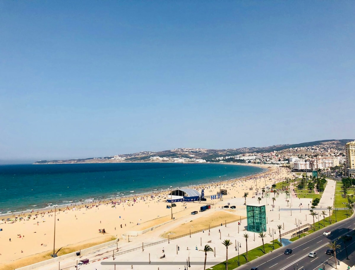 Emplacement n °1 à TANGER! Plage directement en face avec un grand balcon vue partielle de la mer. Meilleur emplacement à Tanger. Télévision par satellite-WiFi Fibre, Netflix, Iptv.Tout est accessible à pied marina ,veille ville,Macdonald, pubs,cafés.... Les voyageurs munis d'une voiture auront une place de parking gratuite dans le garage de la résidence avec accès direct à l'appartement.Sécurité 24h/24 . Soyez mon voyageur. * Avant de réserver, veuillez lire attentivement ma description MERCI🙏🙏