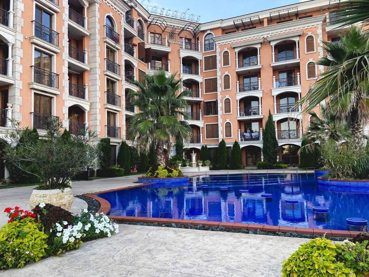 Perekondlik korterhotell Cascadas Resort asub Sunny Beachis, vaid 600 meetri kaugusel rannast ja 9-minutilise jalutuskäigu kaugusel. Külalised pääsevad restoranist 11 värske ja soolase veega välibasseini juurde, mille ääres on baarid. Tasuta wifi kogu majutuskohas. Veepark 10 minuti kaugusel. Külalistele on tasuta spordikeskus ja hüdromassaaži ja aurusaunaga tervisespaa. Seal on temaatiline ökopark, 2 miniveeparki ja igapäevased tegevused lastele