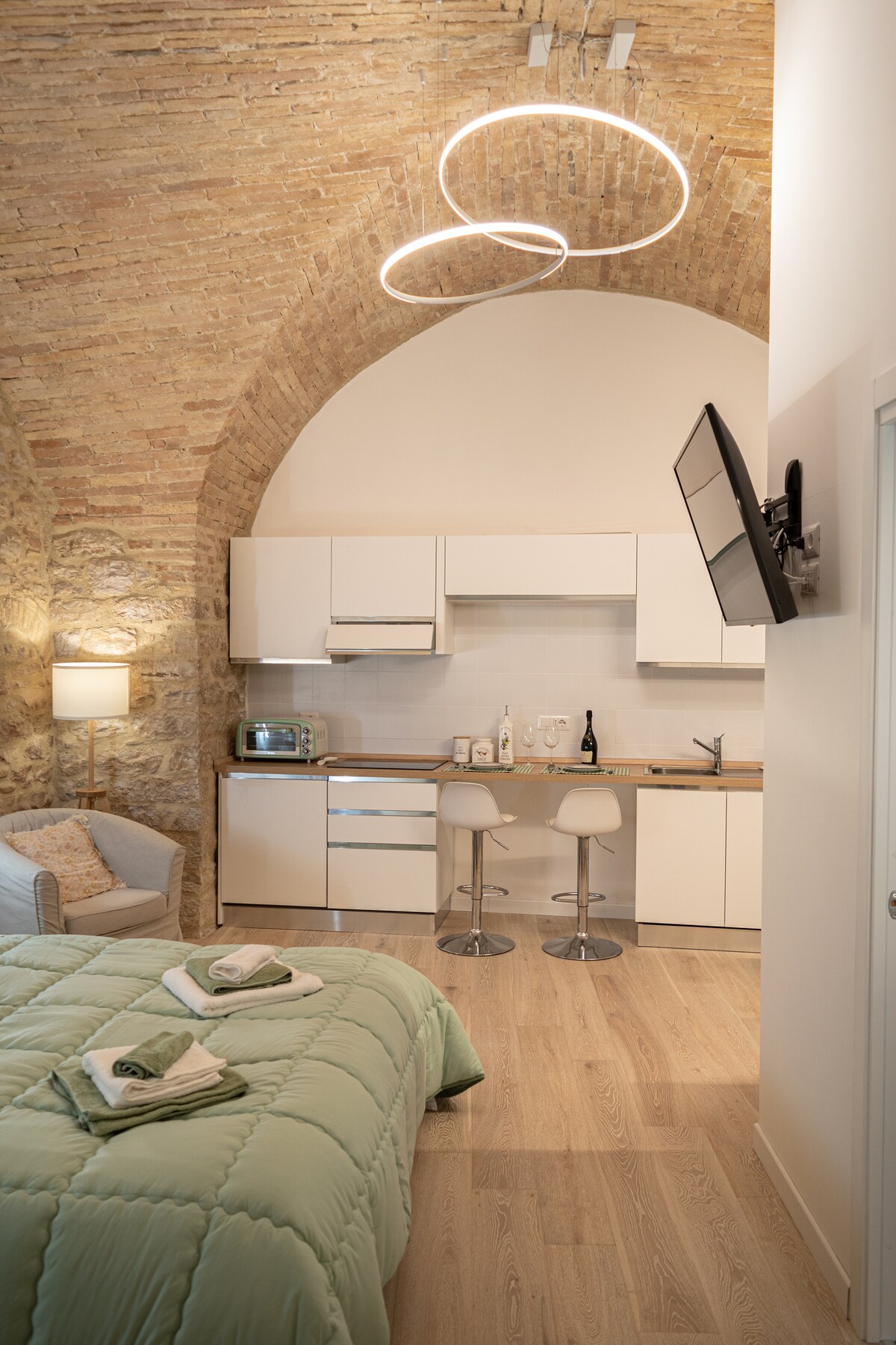 Valge kahetoaline korter esimesel korrusel, vana maja renoveerimise tulemus, mis ühendab endas modernsust ja antiikset, luues lõõgastava ja romantilise ruumi. Ümbritsetud monumentide ja kloostritega, võid tunda illusiooni, et reisid minevikku ja samal ajal jääd ühendatuks olevikuga ja ülikooli ja restoranide/klubide elava seltsieluga. 10-minutilise jalutuskäigu kaugusel kesklinna väljakust. Lähedal tasuta parkimisplatsile ja bussipeatusele, mis tuleb rongijaamast.