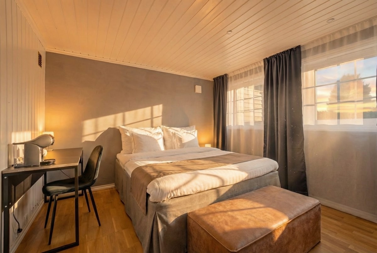 Moodne, valgusküllane, rahulik ja soe pööningukorter eraldi sissepääsuga, avara rõduga, kus on pärastlõuna- ja õhtupäike, ning heade parkimisvõimalustega. Mahutab 4 inimest: 150 cm kaheinimesevoodi, lisavoodi 90 cm, mida saab liigutada ja juurdepääs madratsile põrandal. Täielikult varustatud köök induktsioonipliidi, nõudepesumasina, mikrolaineahjuga ahju, samuti pesumasina, kuivati ja suure garderoobiga. Lühike vahemaa järveni, ujumis- ja matkapiirkondadeni. 2 km Vallermyrene Ridesenterini, 2,5 km E18-ni, 4 km Porsgrunni kesklinna.