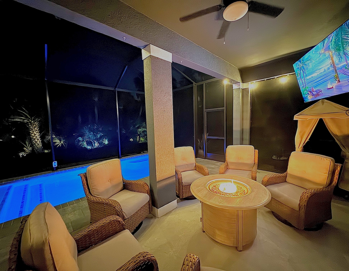 Elutoas on 65-tolline nutiteler,seinale paigaldatud ruumilise heli all olev vedelkristallega kamin - kõigil teleritel on Netflix. Baaritoas on väike külmik,piljardilaud ja noolelaud. Väljas on privaatne lanai, kus on soojendusega bassein ja propaanikamin. Naudi 55-tollise nutiteleriga helina magamistoas, teises magamistoas on ka teler. Baarituba, kus on ka sonod ja lanai.30 minuti kaugusel mitmest rannast. Garaaž ei ole saadaval. Kodu asub vaikses Cul de Sacis