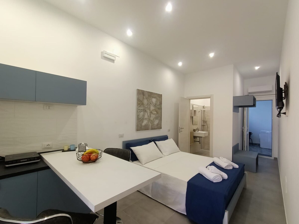35 ruutmeetri suurune valgusküllane stuudio, kesklinnast mõne meetri kaugusel ja mere lähedal. Kõik kaubanduslikud mugavused lähedal. Elutuba, varustatud köögiga, nelja tooliga laud, diivanvoodi ja televiisor, vaatega esiterrassile, lõõgastumisalaga, mis on varustatud toolide ja kohvilauaga. Magamiskoht kaheinimesevoodi ja kapiga. Vannituba suure duši ja mullivanniga. Konditsioneeriga küttesüsteem. Varustatud vannitoa voodipesu, voodi ja köögiga. Äsja renoveeritud.