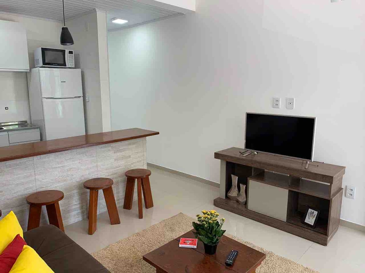 Ööbige kaunis Jurerê meres (Florianópolis, SC) Ameerika köögiga täismoodsas pööningus, kahekohalises voodis, jagatud õhukonditsioneeriga, 40-tollise LED-kaabliga SmarTV Youtube 'i ja Netflixiga, minibaaris, pliidis, mikrolaineahjus, soojas vannis ja suurel rõdul, kust avaneb vaade merele.