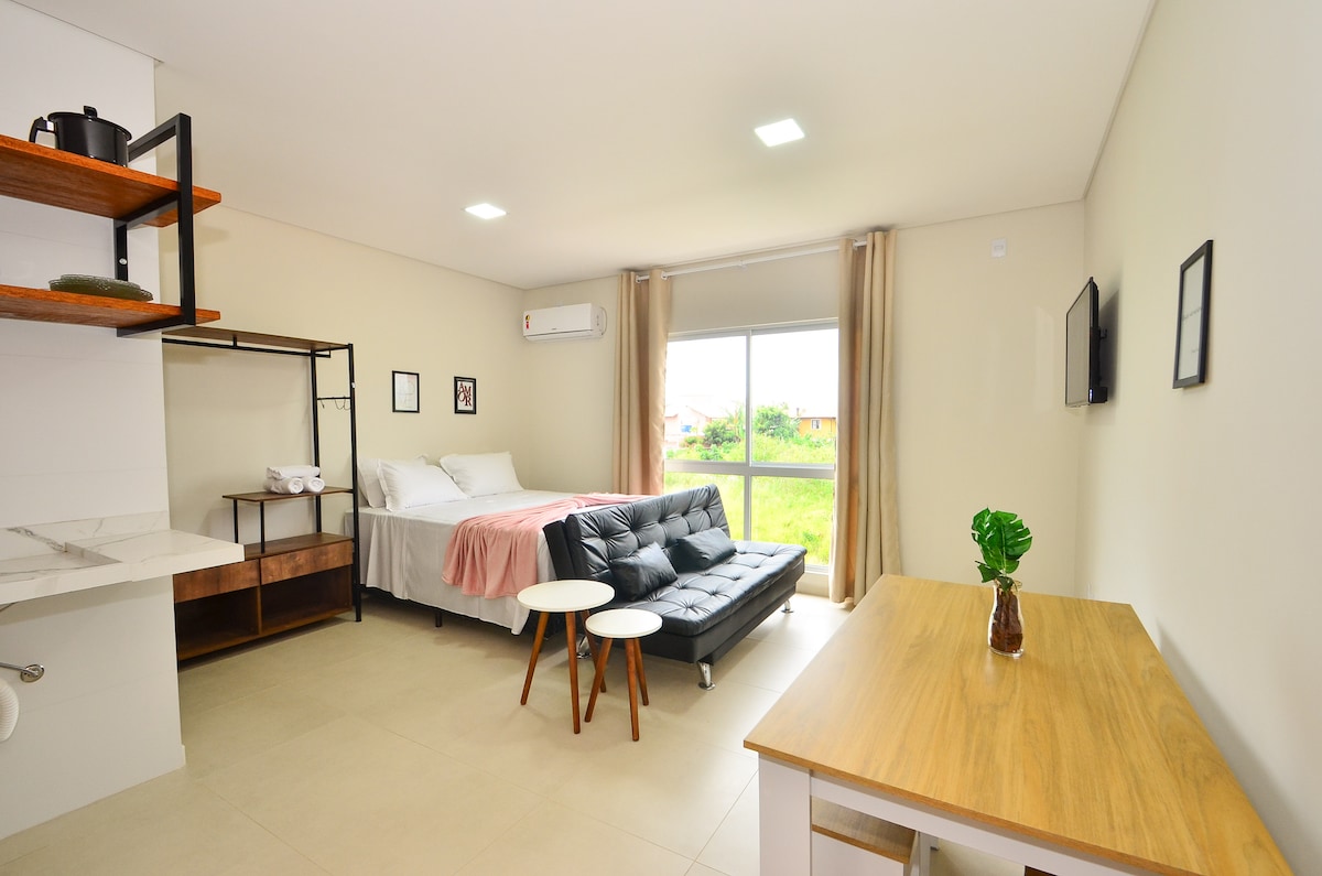 Uus stuudio! Arhitektuurne disain mugava ja funktsionaalse disainiga. Stabiilne ja võimas internet, ideaalne töötamiseks ja lõbutsemiseks samas kohas, 400 m kaugusel merest. Kohandatud mööbel, uued seadmed, mis on mõeldud sinu majanduse ja praktilisuse jaoks, kliimaseade, soe vesi kõigis kraanides, pesumasin-kuivati, 43-tolline teler, Dolce Gusto kohvimasin, ClaroTV, Disney ja Netflix. Peremaja, vaikne, basseini ja garaažiga. Vaba aeg või tööta ideaalse peatumise Florianopolises.