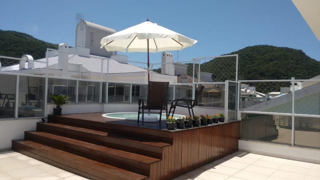 Cobertura EXCLUSIVA com JACUZZI AQUECIDA na sua ampla ÁREA EXTERNA PRIVATIVA, iluminação noturna especial e VISTA LIVRE. Localizada acima das construções vizinhas, garante total privacidade e uma vista deslumbrante para as dunas e a Praia do Santinho. O condomínio fica em frente à Praia dos Ingleses — é só atravessar a rua! Aproveite também a piscina de borda infinita do condomínio com vista para o mar.
