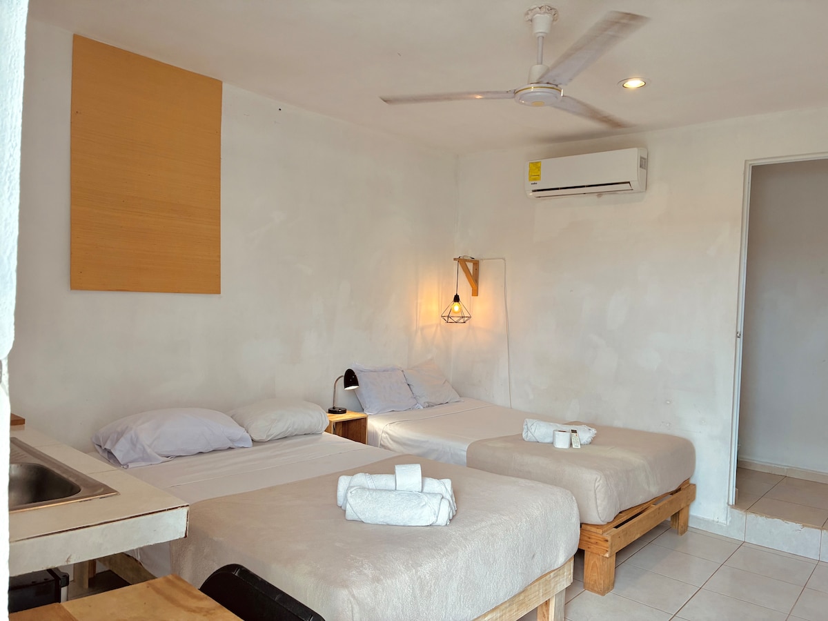 Perfect for beach and nature lovers looking looking for a quiet getaway! One of the best private locations on the island, with direct access to a sandy beach where you can enjoy water sports or simply relax on the shore. Just a 5 minute drive to Cozumel’s downtown area. This newly remodeled suite has everything you need for a comfortable stay including: an open outdoor patio, a large studio, private bathroom, air conditioning, smart TV, Wi-Fi and a kitchenette stocked with new appliances.