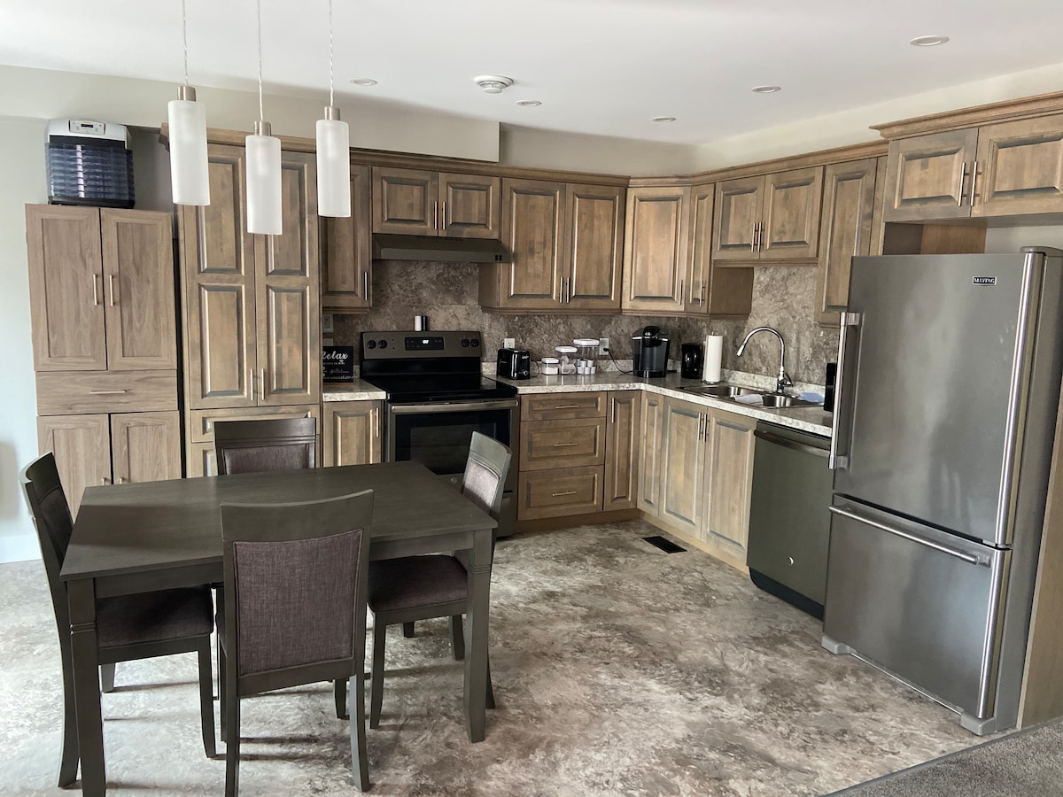 The apartment is located on a quiet cul-du-sac in Deer Lake. It’s centrally located and only 5 minutes drive to the airport. The Deer Lake beach is just a few minutes walk. This property is brand new and features leather furniture, a king sized bed, all brand new appliances, a heat pump for heating and air conditioning and cot for an extra guest. There’s wifi, a smart TV and satellite.