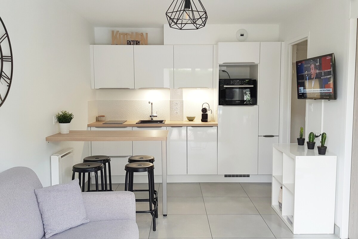 Hubane 25 m2 suurune majutuskoht, mis asub ideaalselt poodide lähedal (250 m kaugusel kesklinnast, 800 m rannast, 50 m supermarketist) 3-korruselises elukohas liftiga, idas. Saadaval on privaatne parkimiskoht (nr 42), samuti jalgrattaruum. Sul on olemas ka meeldiva peatumise jaoks vajalik varustus (nõudepesumasin, kohvimasin + Nespresso (ilma kapsliteta), röster, veekeetja, tsitruspress, tancarville, teler, rõdumööbel).