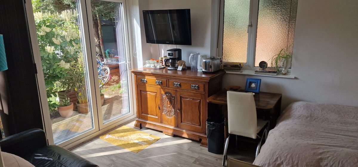 Privaatne juurdepääs, esiuks viib elutuppa ja terrassi uksed aeda. Täielikult sisustatud, diivanvoodi, kirjutuslaud, tee, kohvi valmistamise võimalused, mikrolaineahi, triikraud ja tasuta wifi. Ülakorrus, privaatne duširuum, kaheinimesevoodi, kummut, garderoob ja teler. Peamaja köögi uks ühendab lisa ja jääb lukustatuks. Austame oma külaliste privaatsust, kuid oleme vajaduse korral saadaval. Lühikese jalutuskäigu kaugusel linna-/rongijaamadest ning supermarketitest, restoranidest ja pubidest, mis asuvad lähedal.
