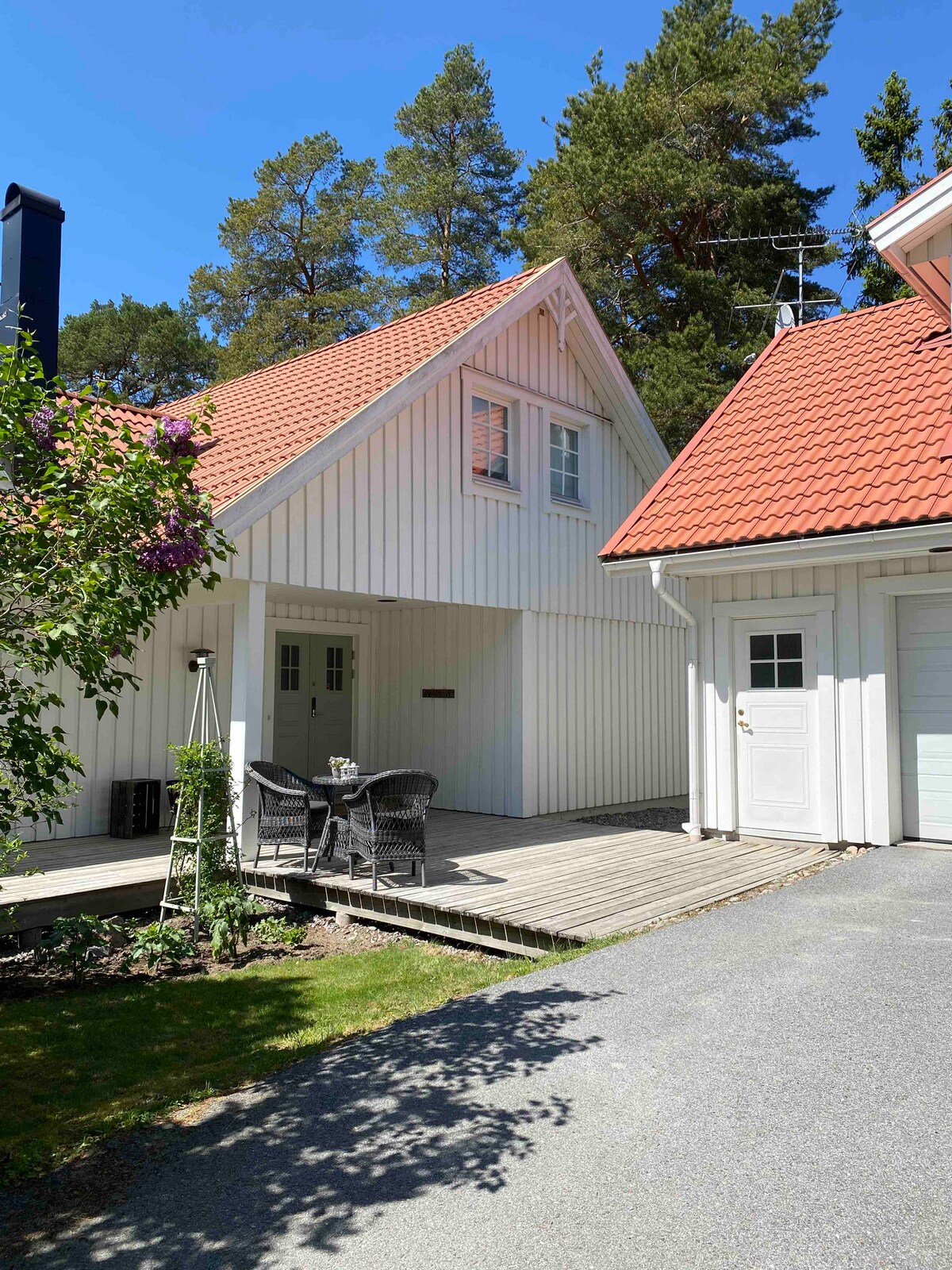 Charming 130-year-old cottage (90 m²) with a modern yet cosy feel. Two renowned spas (Yasuragi & Skepparholmen) within walking distance. Bottom floor: kitchen and dining area with classic wood stove, living room and bathroom. Your own garden and spacious wooden deck—perfect for sunbathing or BBQs. Set in a beautiful area with a crystal-clear lake for bathing just 200 m away, with a nature reserve surrounding it. Sea dock ~700 m. 30 minutes to Stockholm by Waxholm boat, bus or car.