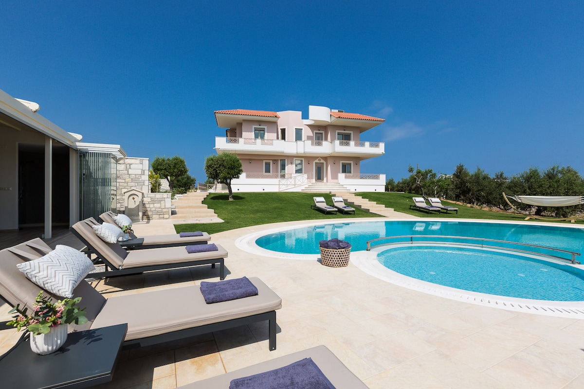 *Palun saada sõnum ENNE broneerimist. Loetlen paljudel saitidel ja mu kalender ei pruugi olla ajakohane. Vastan tavaliselt 1 tunni jooksul * • Privaatne SOOJENDUSEGA bassein + imeline merevaade+aed • Välisoojendusega mullivann • Saun • Jõusaal • Õues söögituba grill • Hämmastav merevaade • mullivann vannitoas • Jalutuskäigu kaugusel Almyrida rannast ja selle restoranist,baarist,poest,kõrtsist,turust • 16 km kaugusel Haniast ja selle vanast sadamast • valmistatud puidust/klaasist/marmorist detailideja mugavustega, mis aitavad teil luksuslikku elustiili