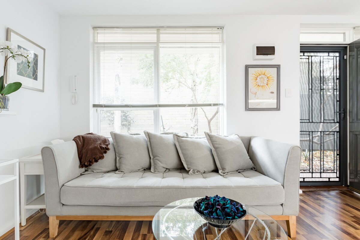 Võta brantš trendikas kohvikus „Rowena Corner Store“ ja seejärel tee lühike jalutuskäik tagasi 1960. aastal ehitatud privaatsesse Richmond Hilli kompleksi. Tagumine sisekujundus ja lehtedega toataimed loovad värske ja kaasaegse tunde, samas kui elegantsed mustad detailid lisavad linna serva. Kas oled valmis telgis või tennises tegutsema? Lühike jalutuskäik läbi naabruses asuva Yarra pargi viib sind otse sinu istekohta. Selles esimesel korrusel asuvas korteris on lihtne ja turvaline juurdepääs ning see asub vaikses asukohas tänavast eemal.