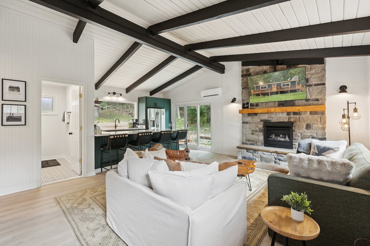 ★30 minutes to the National Park ★Built 2024 ★Walk to Shenandoah River Outfitters ★Great amenities! ★Sleeps 6 (2 on inner spring futon) ★Outdoor areas w/ WINTER VIEWS ★Fire pit ★Fireplace (electric) ★55" Smart TVs in family room, BR1, and BR2 ★BR3 w/ arcade games ★WiFi (faster and more reliable than most in the area) ★Use your own streaming ★Dining area for 4 + bar stools for 2 ★Stylish & upscale ★8 minutes to Bixler's Ferry Boat Launch ★20 mins - Luray ★30 mins - Shenandoah National Parke