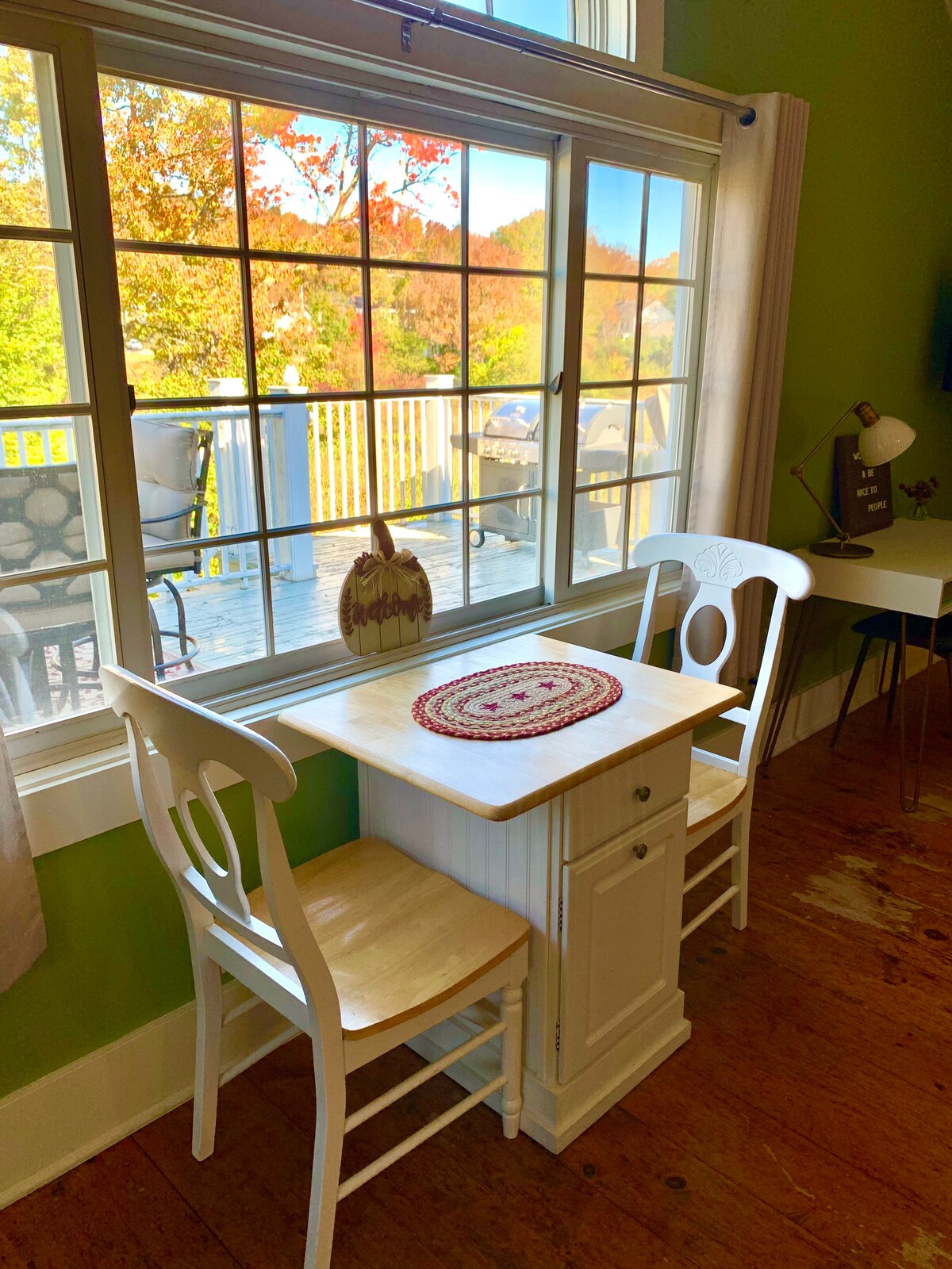 Come relax in the great room! Large space with full bathroom, beautiful picture windows, spacious closet, and use of deck included. Deck includes a cozy fire pit table, gas grill, and a nice view of the beaver pond, great for bird watching! Please don't hesitate to reach out if you are traveling with children and/or pets, we are often able to accommodate on a case by case basis. Please note stairs are required for entry via the deck entrance.