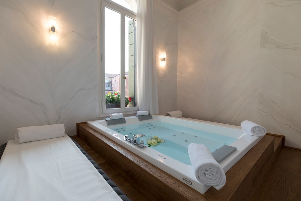 Luxurious apartment with mini Jacuzzi for 2 people, bedroom with king size bed, living room, bar area and bathroom with waterfall shower. Fast Wi-Fi. Located in Campo Sant'Angelo with numerous restaurants and typical trattorias, bars, pharmacies, supermarkets and art galleries. Strategic location just 10 minutes from St Mark's Square, the Accademia, Rialto and 5 minutes from the Fenice Theatre and Palazzo Grassi. Sant'Angelo vaporetto stop 200 metres away.